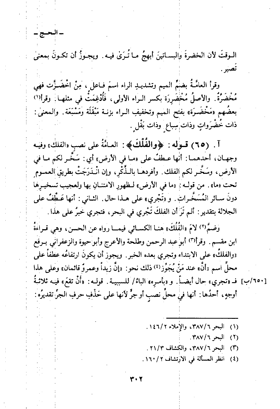 قوله: {والفلك} : العامَّةُ على نصبِ «الفلك» وفيه وجهان، أحدهما: أنها عطفٌ على {مَّا فِي الأرض} أي: سَخَّر لكم ما في الأرض، وسَخَّر لكم الفلك. وأفردها بالذِّكْرِ، وإن انْدَرَجَتْ بطريقِ العمومِ تحت «ما» . ومن قوله: {مَّا فِي الأرض} لظهورِ الامتنانِ بها ولعجيب تسخيرِها دونَ سائر المُسَخَّرات. و «تَجْري» على هذا حال. الثاني: أنها عَطْفٌ على الجلالة بتقدير: ألم تَرَ أن الفلكَ تَجْري في البحر، فتجري خبرٌ على هذا.