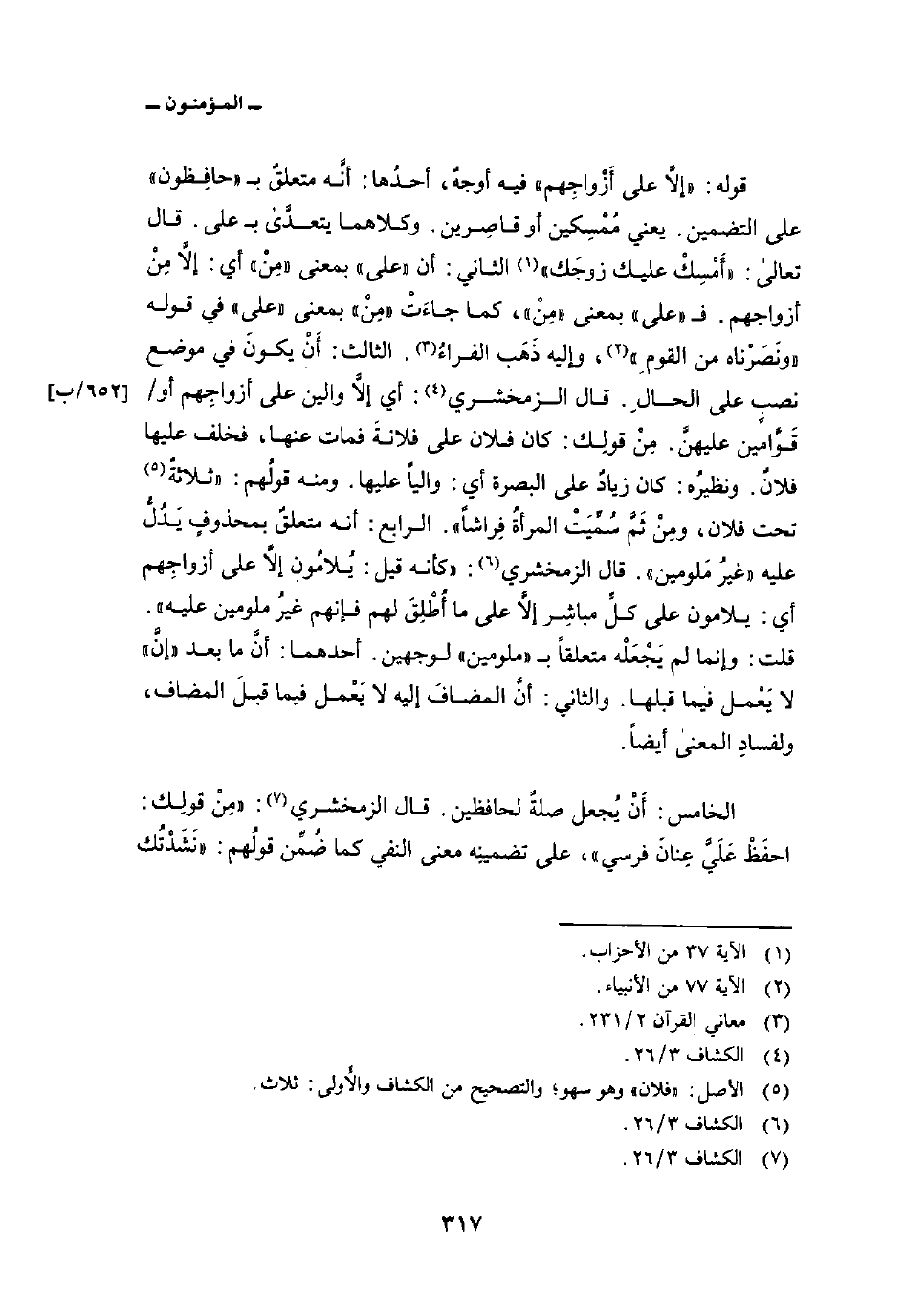 قوله: {إِلاَّ على أَزْوَاجِهِمْ} فيه أوجهٌ، أحدُها: أنَّه متعلقٌ ب «حافِظون» على التضمين. يعني مُمْسِكين أو قاصِرين. وكلاهما يتعدى ب على. قال تعالى: {أَمْسِكْ عَلَيْكَ زَوْجَكَ} [الأحزاب: 37] الثاني: أن «على» بمعنى «مِنْ» أي: إلاَّ مِنْ أزواجهم. ف «على» بمعنى «مِنْ» ، كما جاءَتْ «مِنْ» بمعنى «على» في قوله {وَنَصَرْنَاهُ مِنَ القوم} [الأنبياء: 77] ، وإليه ذَهَب الفراءُ. الثالث: أَنْ يكونَ في موضع نصبٍ على الحالِ. قال الزمخشري: أي إلاَّ والين على أزواجِهم أو/ قَوَّامين عليهنَّ. مِنْ قولِك: كان فلان على فلانةَ فمات عنها، فخلف عليها فلانٌ. ونظيرُه: كان زيادٌ على البصرة أي: والياً عليها. ومنه قولُهم: «ثلاثةٌ تحت فلان، ومِنْ ثَمَّ سُمِّيَتْ المرأةُ فِراشاً» . الرابع: أنه متعلقٌ بمحذوفٍ يَدُلُّ عليه «غيرُ مَلومين» . قال الزمخشري: «كأنه قيل: يُلامُون إلاَّ على أزواجِهم أي: يلامون على كلِّ مباشِر إلاَّ على ما أُطْلِقَ لهم فإنهم غيرُ ملومين عليه» . قلت: وإنما لم يَجْعَلْه متعلقاً ب «ملومين» لوجهين. أحدهما: أنَّ ما بعد «إنَّ» لا يَعْمل فيما قبلها.