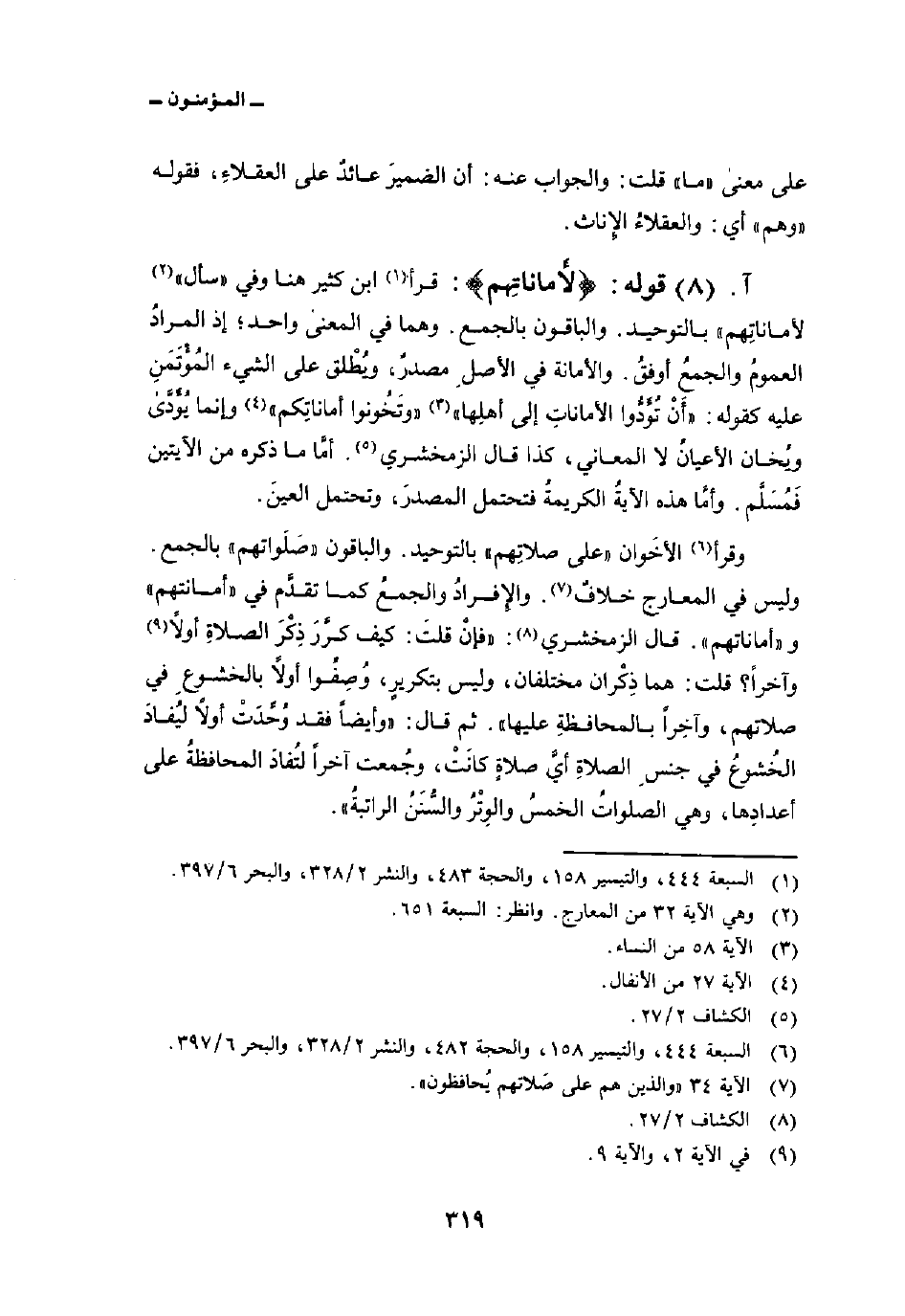 قوله: {لأَمَانَاتِهِمْ} : قرأ ابن كثير هنا وفي «سأل» «لأماناتِهم» بالتوحيد. والباقون بالجمع. وهما في المعنى واحد؛ إذ المرادُ العمومُ والجمعُ أوفقُ. والأمانة في الأصلِ مصدرٌ، ويُطْلق على الشيء المُؤْتَمَنِ عليه كقوله: {أَن تُؤدُّواْ الأمانات إلى أَهْلِهَا} [النساء: 58] {وتخونوا أَمَانَاتِكُمْ} [الأنفال: 27] وإنما يؤدى ويُخان الأعيانُ لا المعاني، كذا قال الزمخشري. أمَّا ما ذكره من الآيتين فَمُسَلَّم. وأمَّا هذا الآيةُ الكريمةُ فتحتمل المصدرَ، وتحتمل العينَ.