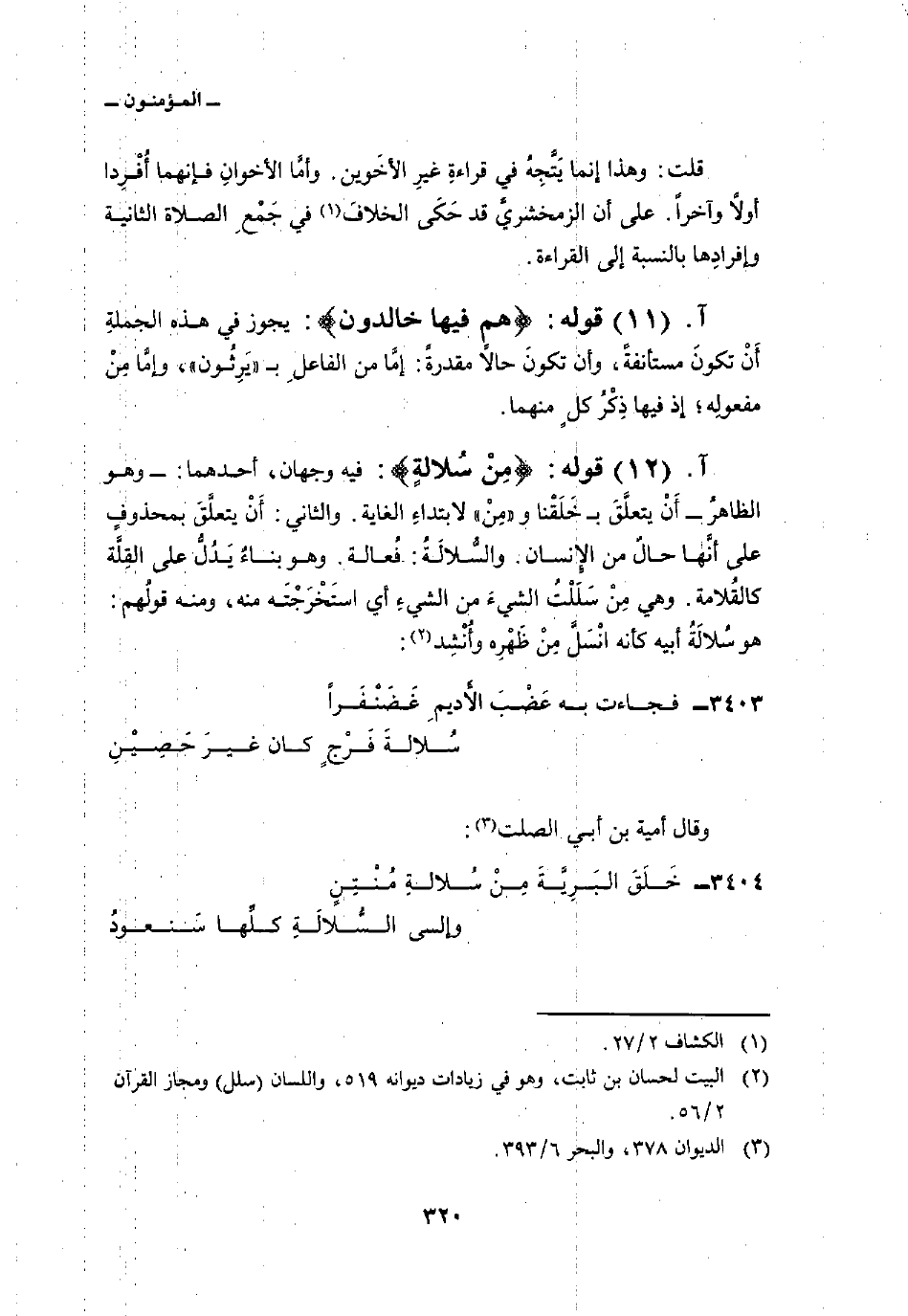 قوله: {مِن سُلاَلَةٍ} : فيه وجهان: أحدهما: وهو الظاهرُ أَنْ يتعلَّقَ ب خَلَقْنا و «مِنْ» لابتداءِ الغاية. والثاني: أَنْ يتعلَّقَ بمحذوفٍ على أنَّها حالٌ من الإِنسان. والسُّلالَةُ: فُعالة. وهو بناءٌ يَدُلُّ على القِلَّة كالقُلامة. وهي مِنْ سَلَلْتُ الشيءَ من الشيءِ أي استَخْرَجْتَه منه، ومنه قولُهم: هو سُلالَةُ أبيه كأنه انْسَلَّ مِنْ ظَهْرِه وأُنْشِد:
