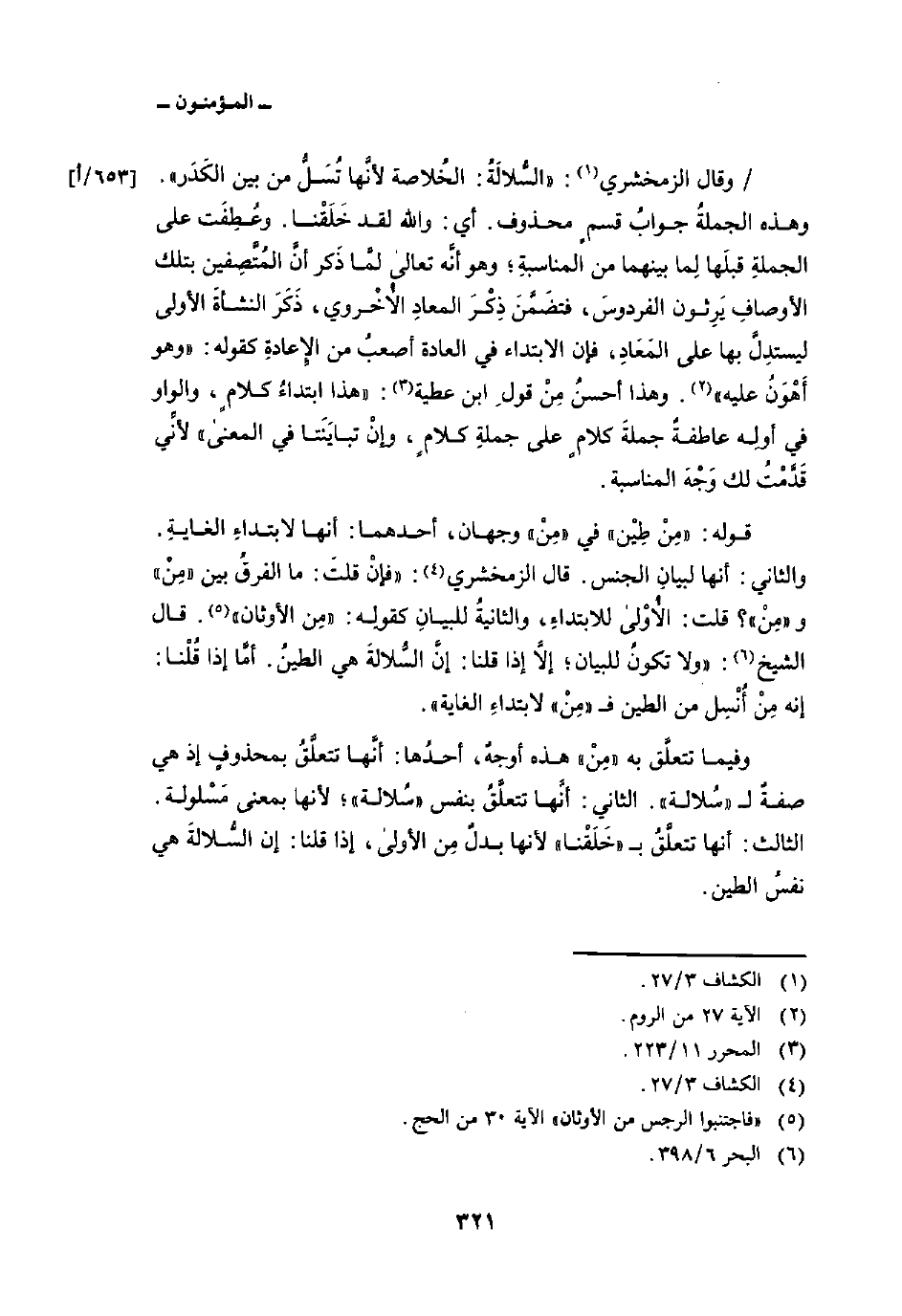 وقال الزمخشري: «السُّلالَةُ: الخُلاصة لأنَّها تُسَلُّ من بين الكَدَر» . وهذه الجملةُ جوابُ قسمٍ محذوف. أي: والله لقد خَلَقْنا. وعُطِفَت على الجملةِ قبلَها لِما بينهما من المناسبةِ؛ وهو أنَّه تعالى لمَّا ذَكر أنَّ المُتَّصِفين بتلك الأوصافِ يَرِثون الفردوسَ، فتضَمَّنَ ذِكْرَ المعادِ الأُخْروي، ذَكَرَ النشأةَ الأولى ليستدِلَّ بها على المَعَادِ، فإن الابتداء في العادة أصعبُ من الإِعادةِ كقوله: {وَهُوَ أَهْوَنُ عَلَيْهِ} [الروم: 27] . وهذا أحسنُ مِنْ قولِ ابن عطية: «هذا ابتداءُ كلامٍ، والواو في أولِه عاطفةٌ جملةَ كلامٍ على جملةِ كلامٍ، وإنْ تبايَنَتا في المعنى» لأنِّي قَدَّمْتُ لك وَجْهَ المناسبة.