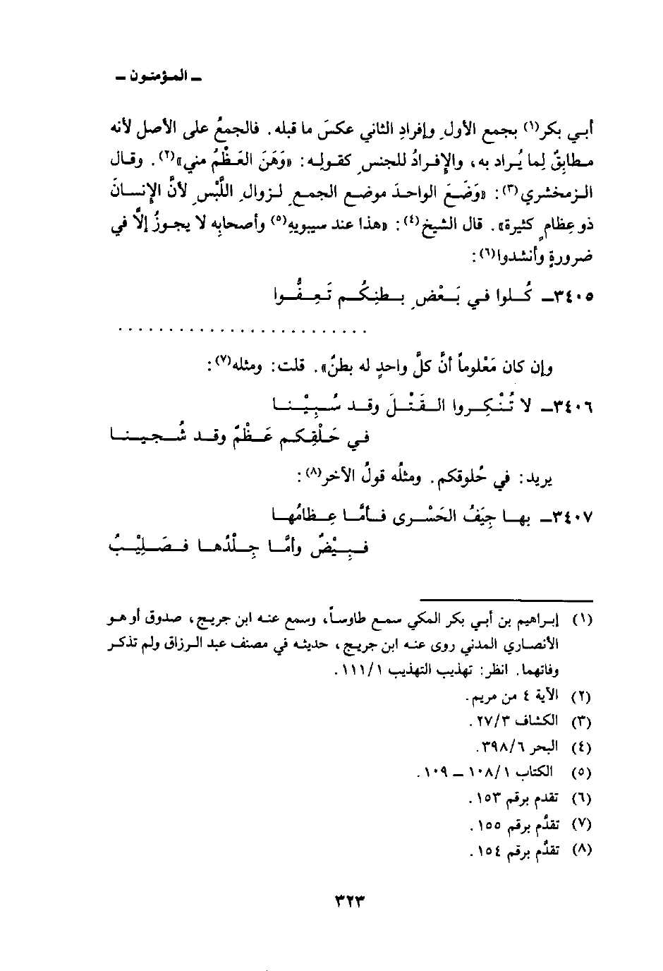 أبي بكر بجمع الأولِ وإفرادِ الثاني عكسَ ما قبله. فالجمعُ على الأصل لأنه مطابِقٌ لِما يُراد به، والإِفرادُ للجنسِ كقولِه: {وَهَنَ العظم مِنِّي} [مريم: 4] . وقال الزمخشري: «وَضَعَ الواحدَ موضع الجمعِ لزوالِ اللَّبْسِ لأنَّ الإِنسانَ ذو عِظامٍ كثيرة» . قال الشيخ: «هذا عند سيبويه وأصحابِه لا يجوزُ إلاَّ في ضرورةٍ وأنشدوا: