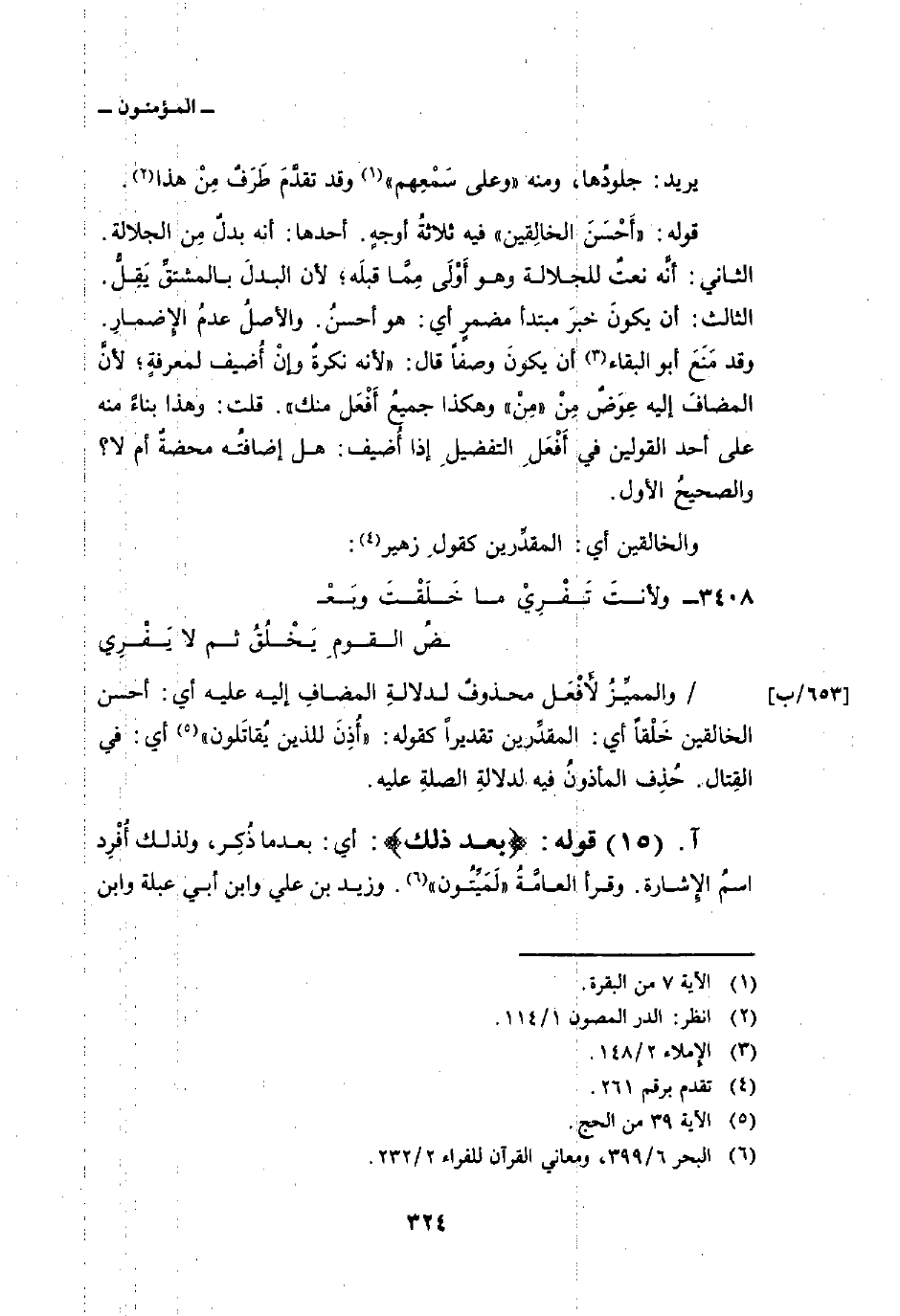 /والمميِّزُ لأَفْعَل محذوفٌ لدلالةِ المضافِ إليه عليه أي: أحسن الخالقين خَلْقاً أي: المقدِّرين تقديراً كقوله: {أُذِنَ لِلَّذِينَ يُقَاتَلُونَ} [الحج: 39] أي: في القِتال. حُذِف المأذونُ فيه لدلالةِ الصلةِ عليه.