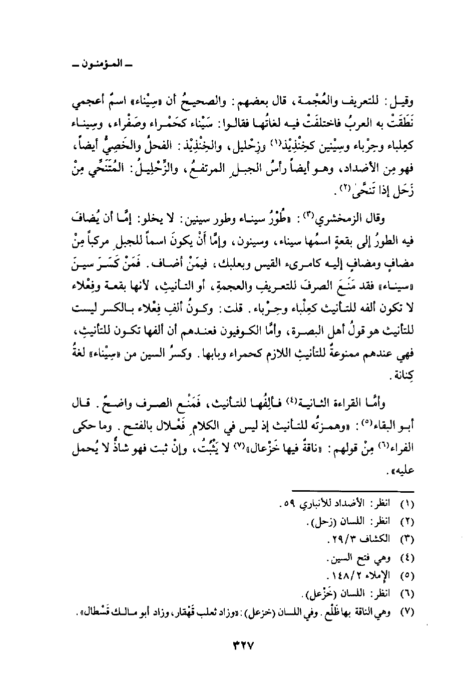 وقال الزمخشري: «طُوْرُ سيناء وطور سينين: لا يخلوا: إمَّا أن يُضافَ فيه الطورُ إلى بقعةٍ اسمُها سيناء، وسينون، وإمَّا أَنْ يكونَ اسماً للجبلِ مركباً مِنْ مضافٍ ومضافٍ إليه كامرىء القيس وبعلبك، فيمَنْ أضاف. فَمَنْ كَسَرَ سينَ» سيناء «فقد مَنَعَ الصرفَ للتعريفِ والعجمةِ، أو التأنيثِ، لأنها بقعة وفِعْلاء لا تكون ألفه للتأنيث كعِلْباء وحِرْباء. قلت: وكونُ ألفِ فِعْلاء بالكسر ليست للتأنيث هو قولُ أهل البصرة، وأمَّا الكوفيون فعندهم أن ألفها تكون للتأنيثِ، فهي عندهم ممنوعةٌ للتأنيثِ اللازم كحمراء وبابها. وكسرُ السين من» سِيْناء «لغةُ كِنانة.