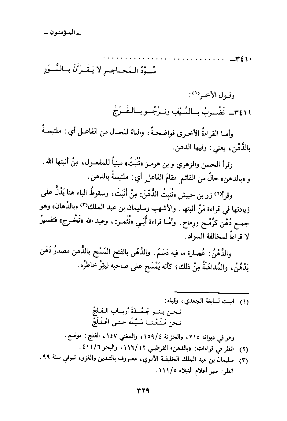 3411 - نَضْربُ بالسَّيْفِ ونرْجُو بالفَرَجْ ... وأما القراءةُ الأخرى فواضحةٌ، والباءُ للحال من الفاعل أي: ملتسبةً بالدُّهْن، يعني: وفيها الدهن.