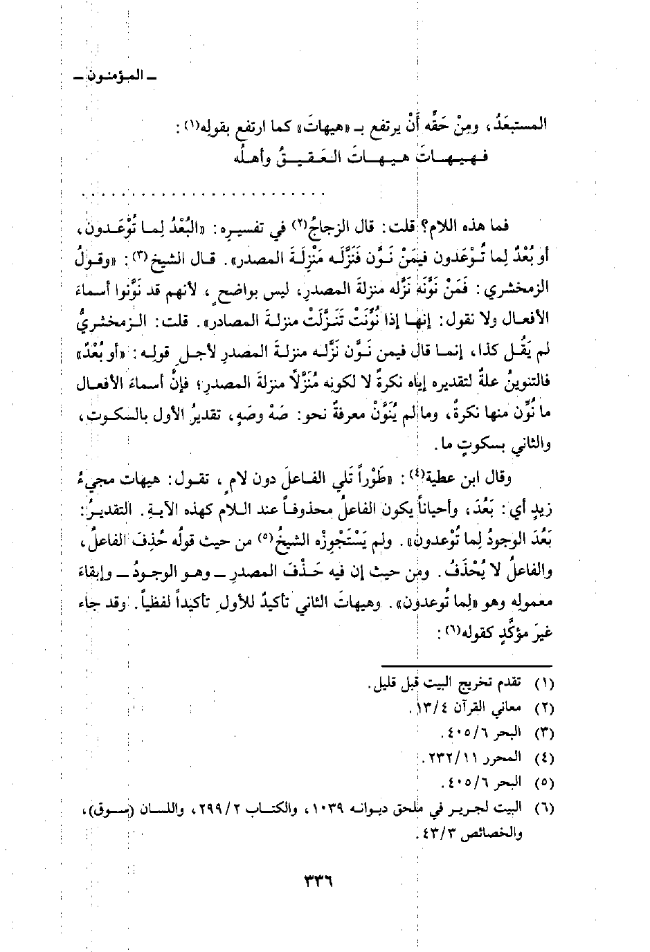 وقال ابن عطية:» طَوْراً تلي الفاعلَ دون لامٍ، تقول: هيهات مجيءُ زيدٍ أي: بَعُدَ، وأحياناً يكون الفاعلُ محذوفاً عند اللام كهذه الآيةِ. التقديرُ: بَعُدَ الوجودُ لِما تُوْعدون «. ولم يَسْتَجْوِزْه الشيخُ ومن حيث قولُه حُذِفَ الفاعلُ، والفاعلُ لا يُحْذَفُ. ومن حيث إن فيه حَذْفَ المصدرِ وهو الوجودُ وإبقاءَ معمولِه وهو» لِما تُوعدون «. وهيهاتَ الثاني تأكيدٌ للأولِ تأكيداً لفظياً. وقد جاء غيرَ مؤكَّدٍ كقوله: