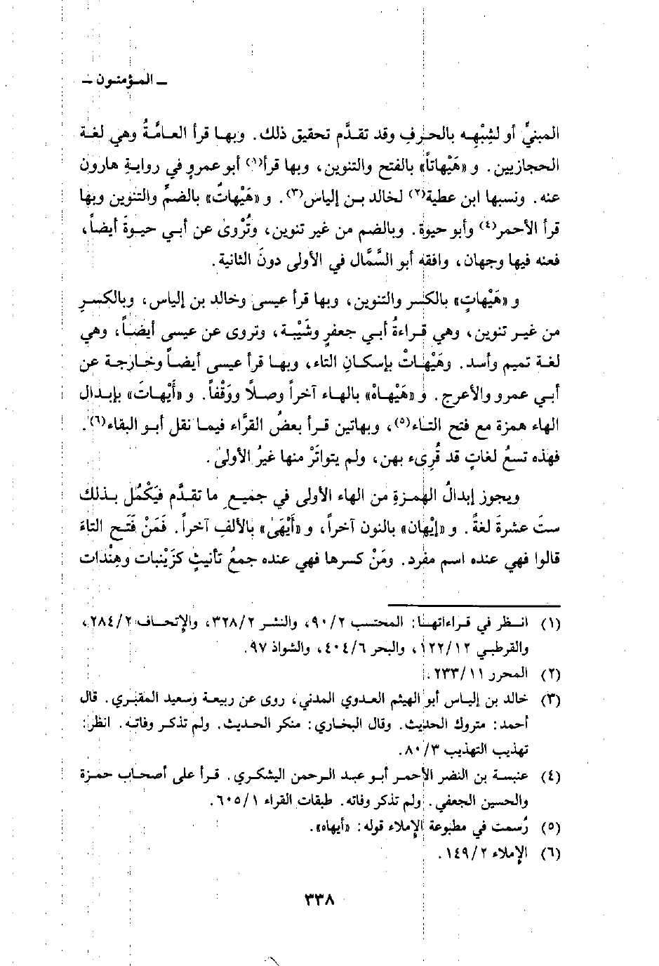 المبنيِّ أو لشِبْهِه بالحرفِ وقد تقدَّم تحقيق ذلك. وبها قرأ العامَّةُ وهي لغة الحجازيين. و» هَيْهاتاً «بالفتح والتنوين، وبها قرأ أبو عمروٍ في روايةِ هارون عنه. ونسبها ابن عطية لخالد بن إلياس. و» هَيْهاتٌ «بالضمِّ والتنوين وبها قرأ الأحمر وأبو حيوة. وبالضم من غير تنوين، وتروى عن أبي حيوةَ أيضاً، فعنه فيها وجهان، وافقه أبو السَّمَّال في الأول دونَ الثانية.