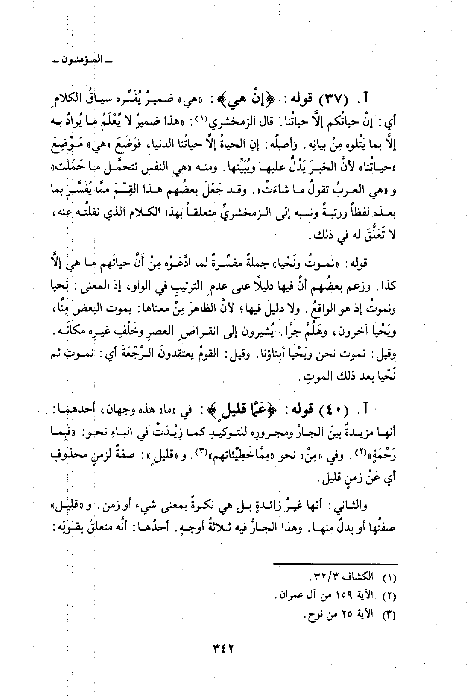 قوله: {إِنْ هِيَ} : «هي» ضميرٌ يُفَسِّره سياقُ الكلامِ أي: إنْ حياتُكم إلاََّ حياتُنا. قال الزمخشري: «هذا ضميرٌ لا يُعْلَمُ ما يُرادُ به إلاَّ بما يَتْلوه مِنْ بيانِه. وأصلُه: إنِ الحياةُ إلاَّ حياتُنا الدنيا، فوَضَعَ» هي «مَوْضِعَ» حياتُنا «لأنَّ الخبرَ يَدُلُّ عليها ويُبَيِّنها. ومنه» هي النفس تتحمَّل ما حَمَلت «و» هي العربُ تقولُ ما شاءَتْ «. وقد جَعَلَ بعضُهم هذا القِسْمَ ممَّا يُفَسَّر بما بعدَه لفظاً ورتبةً ونسبه إلى الزمخشريِّ متعلقاً بهذا الكلام الذي نقلتُه عنه، لا تَعَلُّقَ له في ذلك.