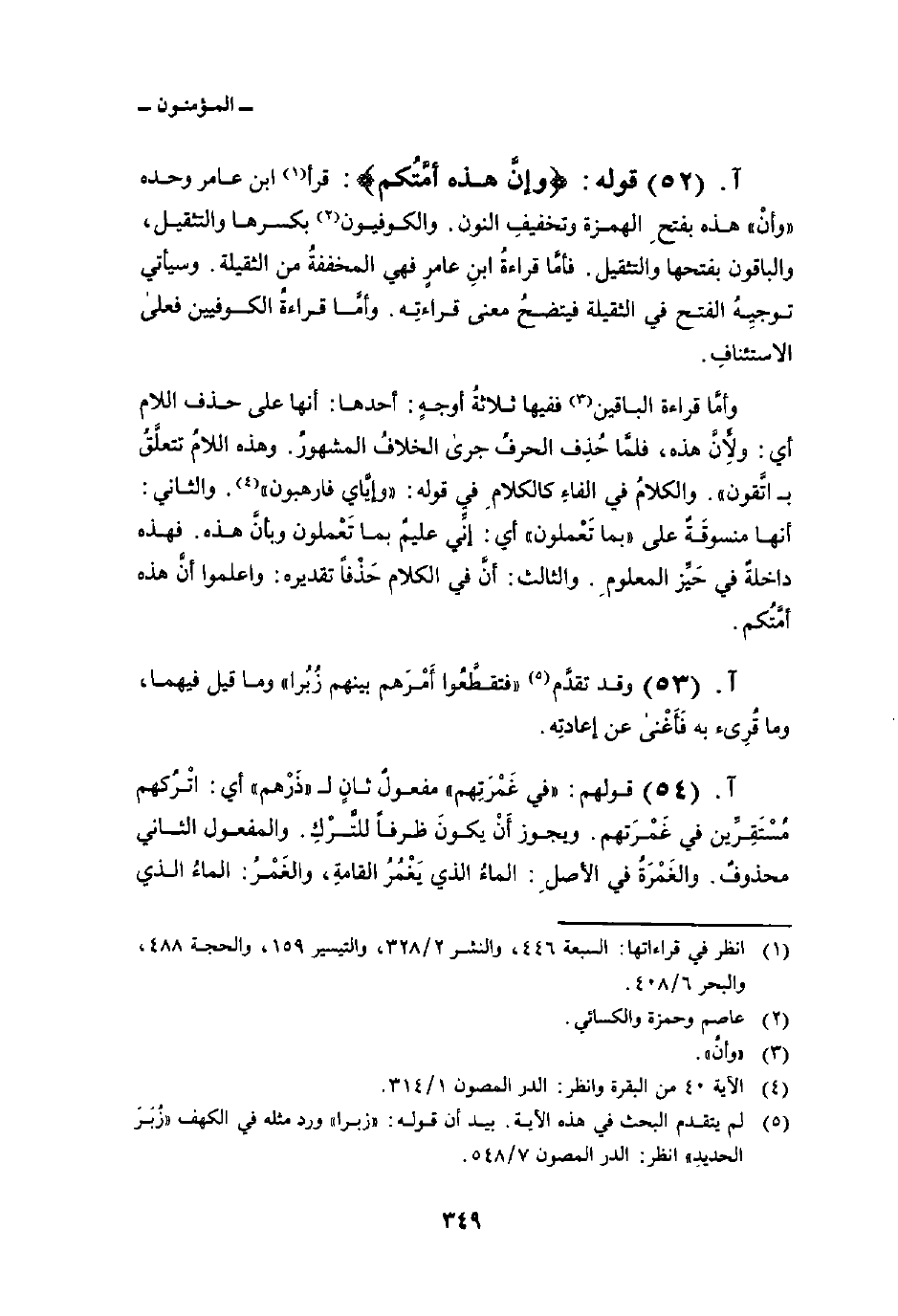وأمَّا قراءة الباقين ففيها ثلاثةُ أوجهٍ: أحدها: أنها على حذف اللام أي: ولأَِنَّ هذه، فلمَّا حُذِف الحرفُ جرى الخلافُ المشهورُ. وهذه اللامُ تتعلَّقُ ب «اتَّقون» . والكلامُ في الفاءِ كالكلامِ في قوله: {وَإِيَّايَ فارهبون} [البقرة: 40] . والثاني: أنها منسوقَةٌ على «بما تَعْملون» أي: إنيِّ عليمٌ بما تَعْملون وبأنَّ هذه. فهذه داخلةٌ في حَيِّز المعلومِ. والثالث: أنَّ في الكلام حَذْفاً تقديره: واعلموا أنَّ هذه أمَّتُكم.