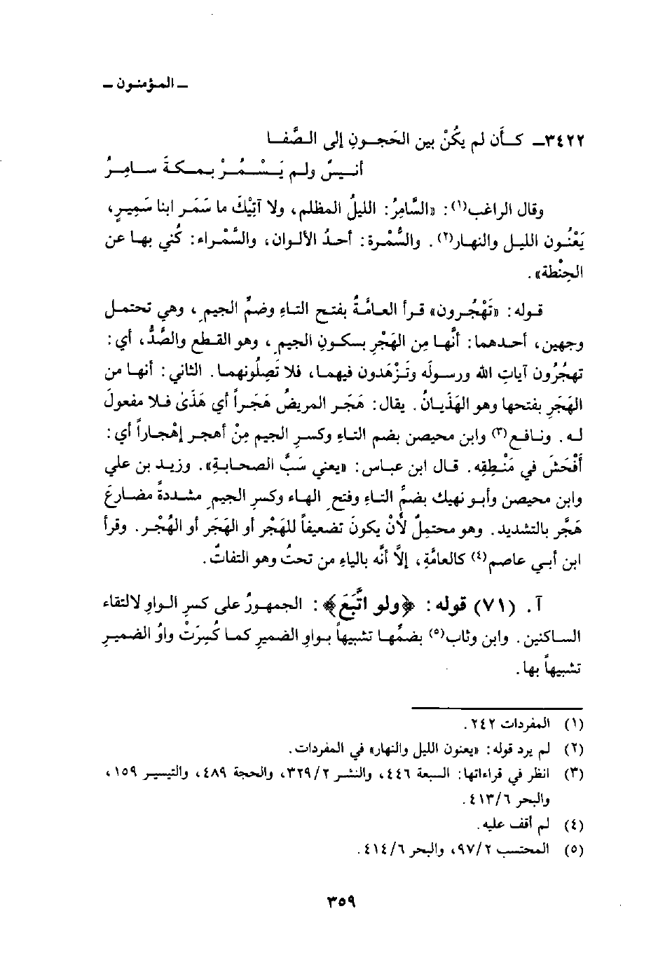 قوله: {تَهْجُرُونَ} قرأ العامَّةُ بفتح التاءِ وضمِّ الجيمِ، وهي تحتمل وجهين، أحدهما: أنَّها مِن الهَجْرِ بسكونِ الجيمِ، وهو القطع والصَّدُ، أي: تهجُرُون آياتِ الله ورسولَه وتَزْهَدون فيهما، فلا تَصِلُونهما. الثاني: أنها من الهَجَرِ بفتحها وهو الهَذَيانُ. يقال: هَجَر المريضُ هَجَراً أي هذى فلا مفعولَ له. ونافع وابن محيصن بضم التاءِ وكسرِ الجيم مِنْ أهجر إهْجاراً أي: أَفْحَشَ في مَنْطِقِه. قال ابن عباس: «يعني سَبَّ الصحابةِ» . زيد بن علي وابن محيصن وأبو نهيك بضمِّ التاءِ وفتحِ الهاء وكسرِ الجيمِ مشددةً مضارعَ هَجَّر بالتشديد. وهو محتمِلٌ لأَنْ يكونَ تضعيفاً للهَجْر أو الهَجَر أو الهُجْر. وقرأ ابن أبي عاصم كالعامَّةِ، إلاَّ أنَّه بالياءِ من تحتُ وهو التفاتٌ.