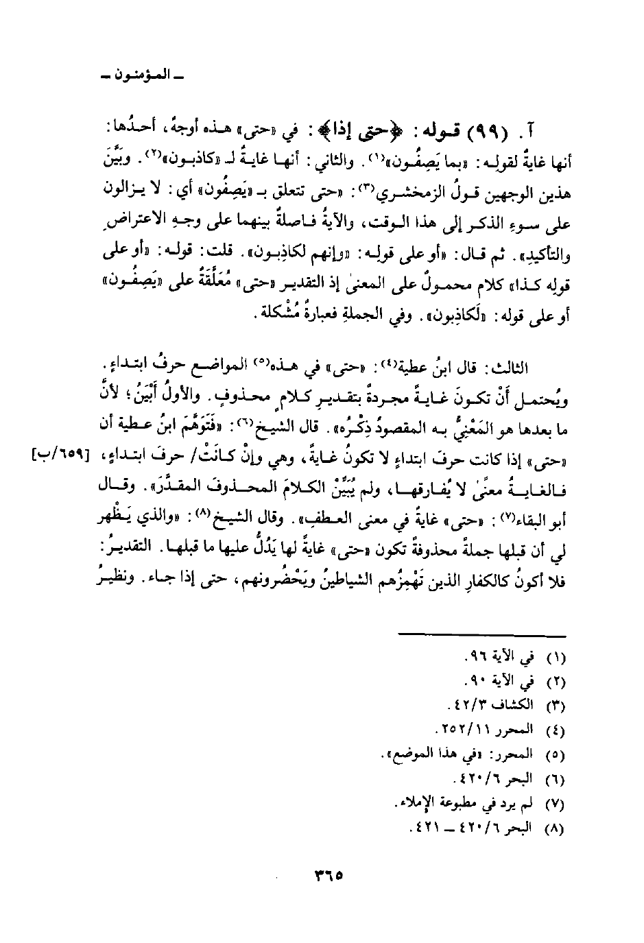 الثالث: قال ابنُ عطية: «حتى» في هذه المواضع حرفُ ابتداءٍ. ويُحتمل أَنْ تكونَ غايةً مجردةً بتقديرِ كلامٍ محذوفٍ. والأولُ أَبْيَنُ؛ لأنَّ ما بعدها هو المَعْنِيُّ به المقصودُ ذِكْرُه «. قال الشيخ:» فَتَوَهَّمَ ابنُ عطية أن «حتى» إذا كانت حرفَ ابتداءٍ لا تكونَ غايةً، وهي وإنْ كانَتْ: حرفَ ابتداءٍ، فالغايةُ معنًى لا يُفاريقها، ولم يُبَيِّنْ الكلامَ المحذوفَ المقدَّرَ «. وقال أبو البقاء:» حتى «غايةٌ في معنى العطفِ» . وقال الشيخ: «والذي يَظْهر لي أن قبلها جملةً محذوفةً تكون» حتى «غايةً لها يَدُلُّ عليها ما قبلها. التقديرُ: فلا أكونُ كالكفارِ الذين تَهْمِزُهم الشياطينُ ويَحْضُرونهم، حتى إذا جاء. ونظيرُ