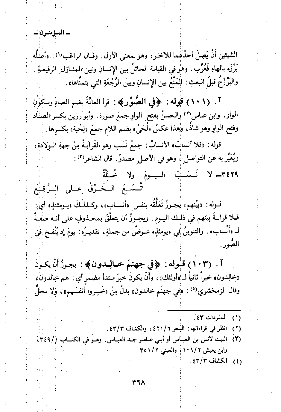 قوله: {بَيْنَهُمْ} يجوزُ تَعَلُّقُه بنفسِ «أنساب» ، وكذلكَ «يومئذٍ» أي: فلا قرابةَ بينهم في ذلك اليوم. ويجوزُ أن يتعلَّقَ بمحذوفٍ على أنه صفةٌ ل «أَنْساب» . والتنوينُ في «يومئذٍ» عوضٌ من جملةٍ، تقديرهُ: يومَ إذ يُنْفخ في الصُّور.