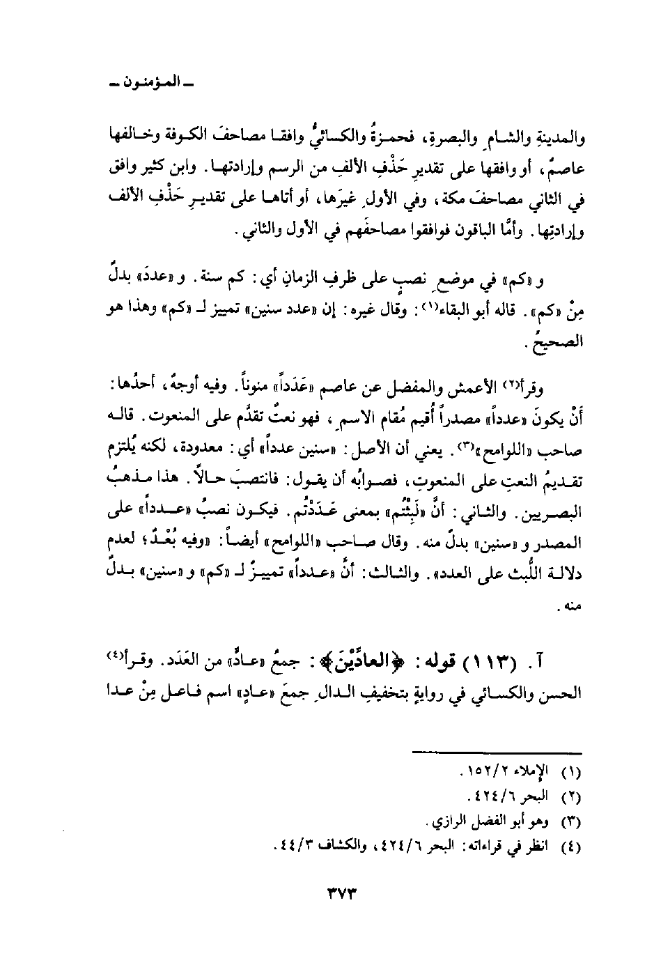 وقرأ الأعمش والمفضل عن عاصم «عَدَداً» منوناً. وفيه أوجهٌ، أحدُها: أَنْ يكونَ «عدداً» مصدراً أُقيم مُقام الاسمِ، فهو نعتٌ تقدَّم على المنعوت. قاله صاحب «اللوامح» . يعني أن الأصل: «سنين عدداً» أي: معدودة، لكنه يُلتزم تقديمُ النعتِ على المنعوتِ، فصوابُه أن يقول: فانتصبَ حالاً. هذا مذهبُ البصريين. والثاني: أنَّ «لَبِثْتُم» بمعنى عَدَدْتُم. فيكون نصبُ «عدداً» على المصدر و «سنين» بدلٌ منه. وقال صاحب «اللوامح» أيضاً: «وفيه بُعْدٌ؛ لعدم دلالة اللُّبث على العدد» . والثالث: أنَّ «عدداً» تمييزٌ ل «كم» و «سنين» بدلٌ منه.