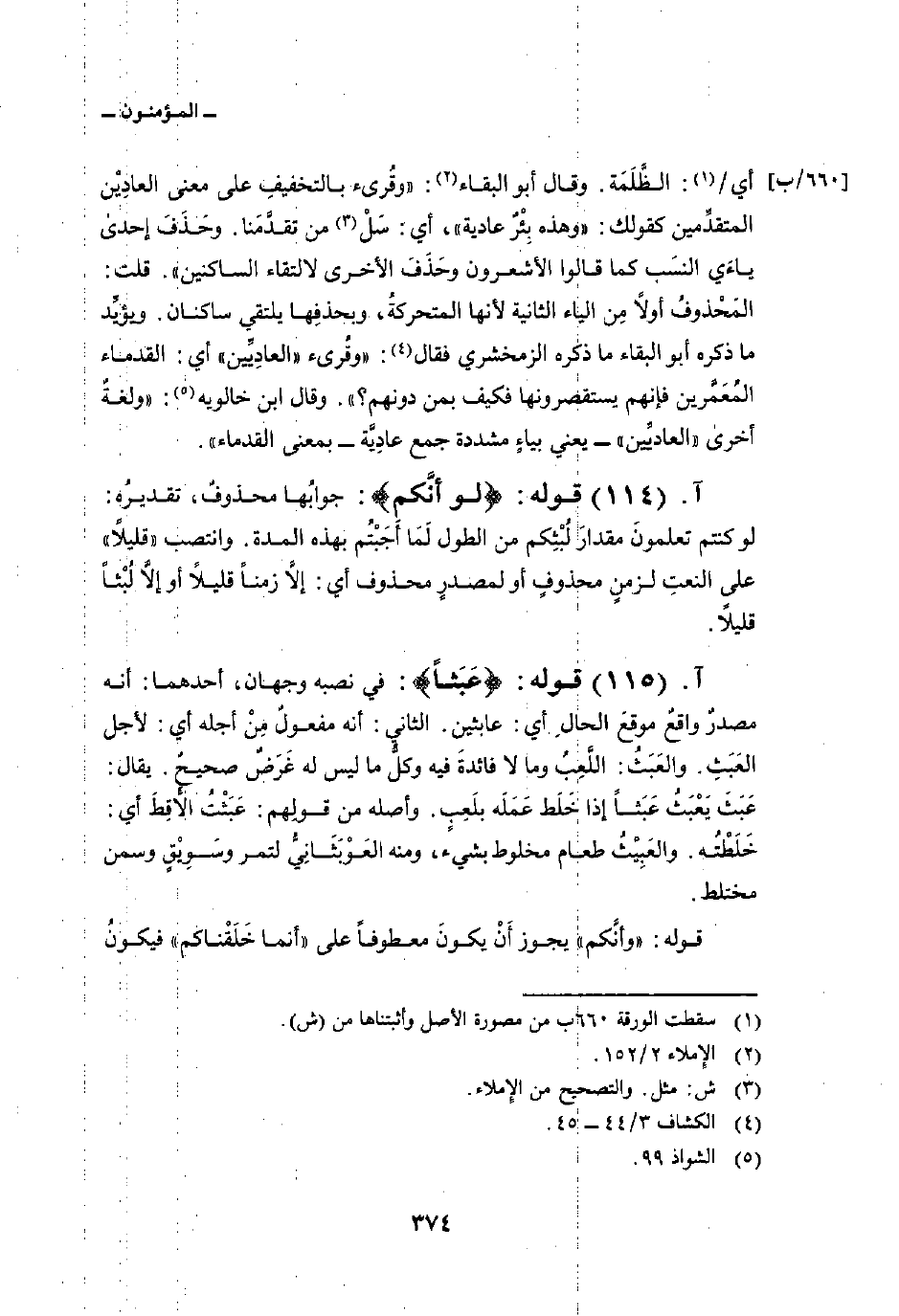 أي/: الظَّلَمَة. وقال أبو البقاء: «وقُرىء بالتخفيفِ على معنى العادِيْن المتقدِّمين كقولك:» وهذه بِئْرٌ عادية «، أي: سَلْ من تقدَّمَنا. وحَذَفَ إحدى ياءَي النسَب كما قالوا الأشعرون وحَذَفَ الأخرى لالتقاء الساكنين» . قلت: المَحْذوفُ أولاً مِن الياء الثانية لأنها المتحركةُ، وبحذفِها يلتقي ساكنان. ويؤيِّد ما ذكره أبو البقاء ما ذكره الزمخشري فقال: «وقُرىء» العادِيِّين «أي: القدماء المُعَمَّرين فإنهم يستقصرونها فكيف بمن دونهم؟» . وقال ابن خالويه: «ولغةٌ أخرى» العاديِّين «يعني بياءٍ مشددة جمع عادِيَّة بمعنى القدماء» .