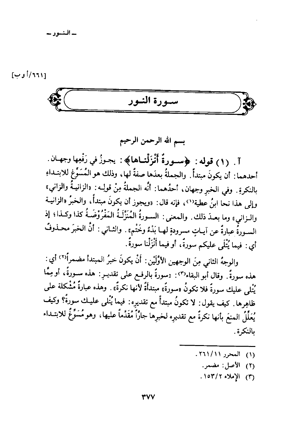 والوجهُ الثانِ مِنَ الوجَهين الأَوَلَيْن: أَنْ يكونَ خبرُ المبتدأ مضمراً أي: هذه سورةٌ. وقال أبو البقاء: «سورةٌ بالرفع على تقديرِ: هذه سورةٌ، أو مِمَّا يُتْلى عليك سورةٌ فلا تكونُ» سورةٌ «مبتدأَةً لأنها نكرةٌ» . وهذه عبارةٌ مُشكلة على ظاهِرها. كيف يقول: لا تكونُ مبتدأً مع تقديرِه: فيما يُتْلى عليك سورةٌ؟ وكيف يُعَلِّلُ المنعَ بأنها نكرةٌ مع تقديرِه لخبرِها جارَّاً مُقَدَّماً عليها، وهو مُسَوِّغٌ للابتداء بالنكرة.