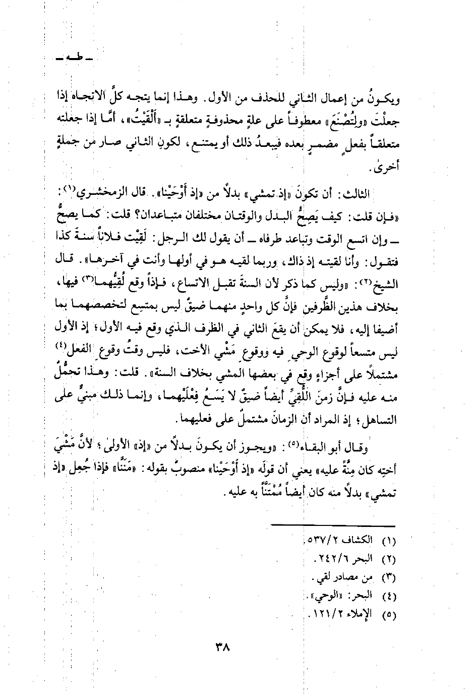 الثالث: أن تكونَ «إذ تمشي» بدلاً من «إذ أَوْحَيْنا» . قال الزمخشري: «فإن قلت: كيف يَصِحُّ البدل والوقتان مختلفان متباعدان؟ قلت: كما يصحُّ وإن اتسع الوقت وتباعد طرفاه أن يقول لك الرجل: لَقِيْت فلاناً سنةَ كذا فتقول: وأنا لقيته إذ ذاك، وربما لقيه هو في أولها وأنت في آخرها» . قال الشيخ: «وليس كما ذكر لأن السنةَ تقبل الاتساع، فإذاً وقع لُقِيُّهما فيها، بخلاف هذين الظَّرفين فإنَّ كل واحدٍ منهما ضيقٌ ليس بمتسعٍ لتخصصهما بما أضيفا إليه، فلا يمكن أن يقعَ الثاني في الظرف الذي وقع فيه الأول؛ إذ الأول ليس متسعاً لوقوع الوحيِ فيه ووقوعِ مَشْي الأخت، فليس وقتُ وقوعِ الفعل مشتملاً على أجزاءٍ وقع في بعضها المشي بخلاف السنة» . قلت: وهذا تحمُّلٌ منه عليه فإنَّ زمنَ اللُّقِيِّ أيضاً ضيقٌ لا يَسَعُ فِعْلَيْهما، وإنما ذلك مبنيٌّ على التساهل؛ إذ المراد أن الزمانَ مشتملٌ على فعليهما.