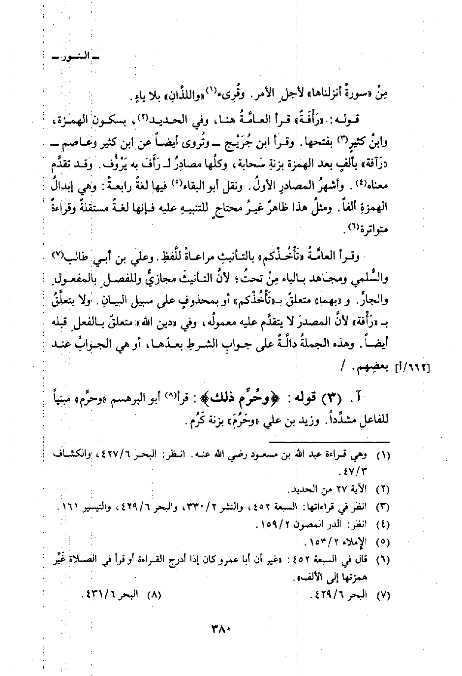 قوله: {رَأْفَةٌ} قرأ العامَّةُ هنا، وفي الحديد، بسكون الهمزة، وابنُ كثير بفتحها. وقرأ ابن جُرَيْج وتُروى أيضاً عن ابن كثير وعاصم» رَآفة «بألفٍ بعد الهمزة بزنةِ سَحابة، وكلُها مصادِرُ ل رَأَفَ به يَرْؤُف. وقد تقدَّم معناه. وأشهرُ المصادرِ الأولُ. ونقل أبو البقاء فيها لغةً رابعةً: وهي إبدالُ الهمزةِ ألفاً. ومثلُ هذا ظاهرٌ غيرُ محتاجٍ للتنبيهِ عليه فإنها لغةٌ مستقلةٌ وقراءةٌ متواترة.