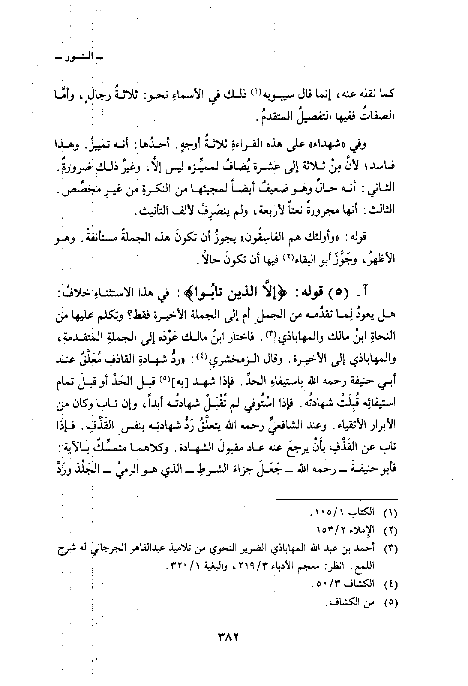قوله: {إِلاَّ الذين تَابُواْ} : في هذا الاستثناءِ خلافٌ: هل يعودُ لِما تقدَّمه من الجملِ أم إلى الجملة الأخيرة فقط؟ وتكلم عليها من النحاةِ ابنُ مالك والمهاباذي. فاختار ابنُ مالك عَوْدَه إلى الجملةِ المتقدمةِ، والمهاباذي إلى الأخيرة. وقال الزمخشري: «ردُّ شهادةِ القاذفِ مُعَلَّقٌ عند أبي حنيفة رحمه الله باستيفاءِ الحدِّ. فإذا شهد [به] قبل الحَدَّ أو قبلَ تمام استيفائِه قُبِلَتْ شهادتُه. فإذا اسْتُوفي لم تُقْبَلْ شهادتُه أبداً، وإن تاب وكان من الأبرار الأتقياء. وعند الشافعيِّ رحمه الله يتعلَّقُ رَدُّ شهادِته بنفسِ القَذْفِ. فإذا تاب عن القَذْفِ بأَنْ يرجعَ عنه عاد مقبولَ الشهادة. وكلاهما متمسِّكٌ بالآية: فأبو حنيفةَ رحمه الله جَعَلَ جزاءَ الشرطِ الذي هو الرميُ الجَلْدَ ورَدَّ
