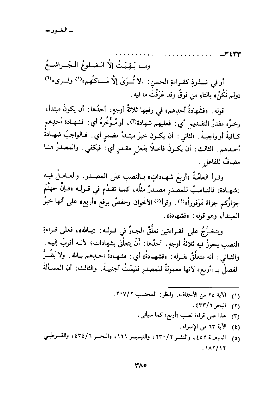 وقرأ العامَّةُ «أربعَ شهاداتٍ» بالنصبِ على المصدر. والعاملُ فيه «شهادة» فالناصبُ للمصدرِ مصدرٌ مثلُه، كما تقدَّم في قولِه {فَإِنَّ جَهَنَّمَ جَزَآؤُكُمْ جَزَاءً مَّوْفُوراً} [الإسراء: 63] . وقرأ الأخَوان وحفصٌ برفع «أربع» على أنها خبرُ المبتدأ، وهو قوله: «فشهادة» .