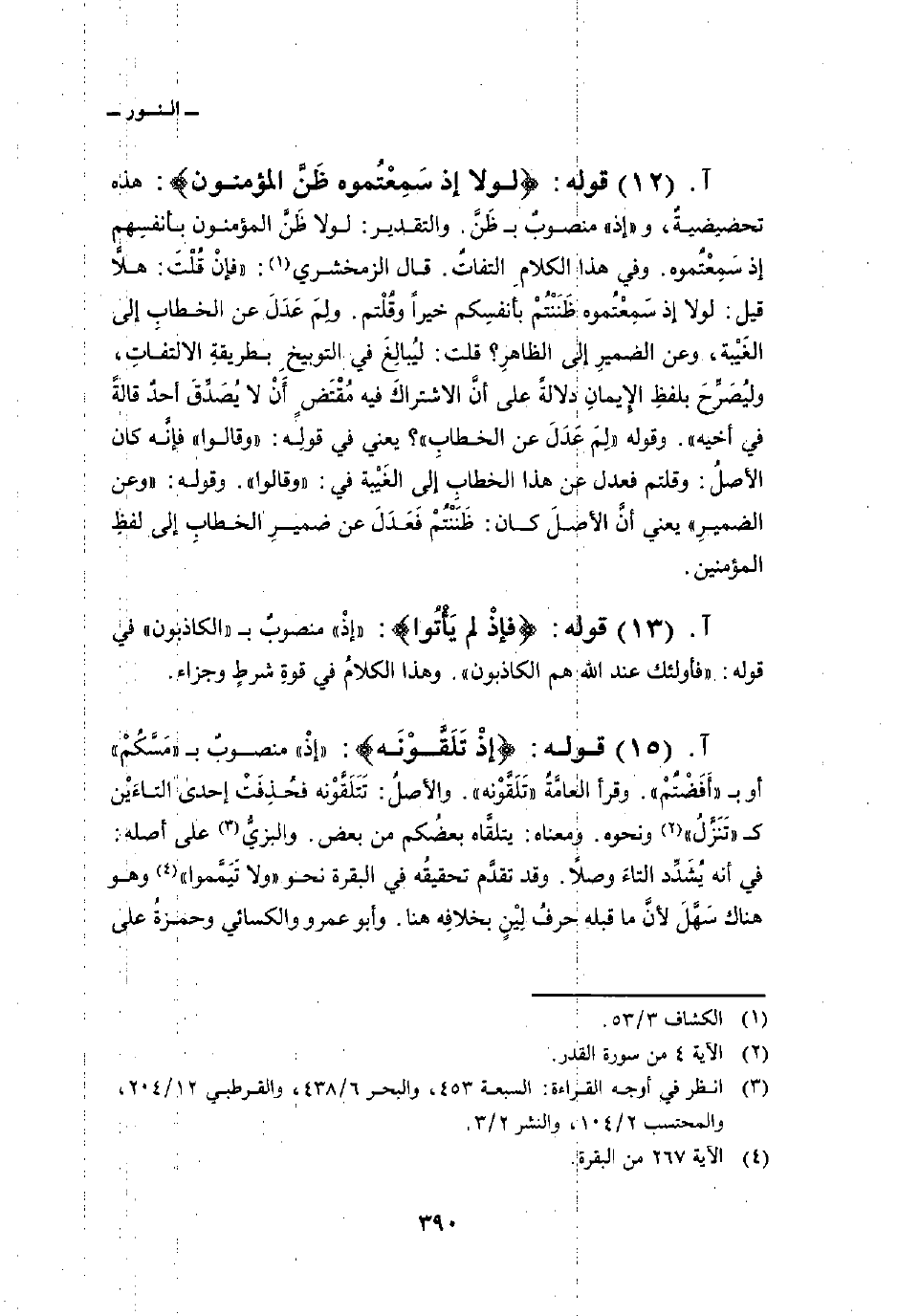 قوله: {لولا إِذْ سَمِعْتُمُوهُ ظَنَّ المؤمنون} : هذه تحضيضيةٌ، و «إذ» منصوبٌ ب ظَنَّ. والتقدير: لولا ظَنَّ المؤمنين بأنفسِهم إذ سَمِعْتُموه. وفي هذا الكلامِ التفاتٌ. قال الزمخشري: «فإنْ قُلْتَ: هلاَّ قيل: لولا إذ سَمِعْتُموه ظَنَنْتُمْ بأنفسِكم خيراً وقُلْتم. ولِمَ عَدَلَ عن الخطابِ إلى الغَيْبة، وعن الضميرِ إلى الظاهرِ؟ قلت: ليُبالِغَ في التوبيخِ بطريقةِ الالتفاتِ، وليُصَرِّحَ بلفظِ الإِيمانِ دلالةً على أنَّ الاشتراكَ فيه مُقْتَضٍ أَنْ لا يُصَدِّقَ أحدٌ قالةً في أخيه» . وقوله «لِمَ عَدَلَ الخطابِ» ؟ يعني في قولِه «وقالوا» فإنَّه كان الأصلُ: وقلتم فعدل عن هذا الخطاب إلى الغَيْبة في: «وقالوا» . وقوله: «وعن الضميرِ» يعني أنَّ الأصلَ كان: ظَنَنْتُمْ فَعَدَلَ عن ضميرِ الخطابِ إلى لفظِ المؤمنين.