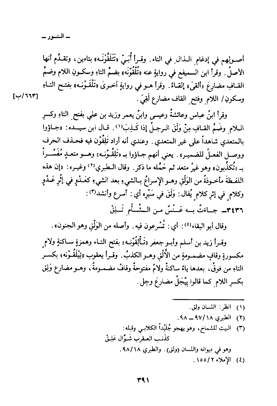 3436 - جاءَتْ به عَنْسٌ من الشَّأْمِ تَلِقْ ... وقال أبو البقاء: أي: تُسْرعون فيه. وأصله من الوَلْقِ وهو الجنون» .