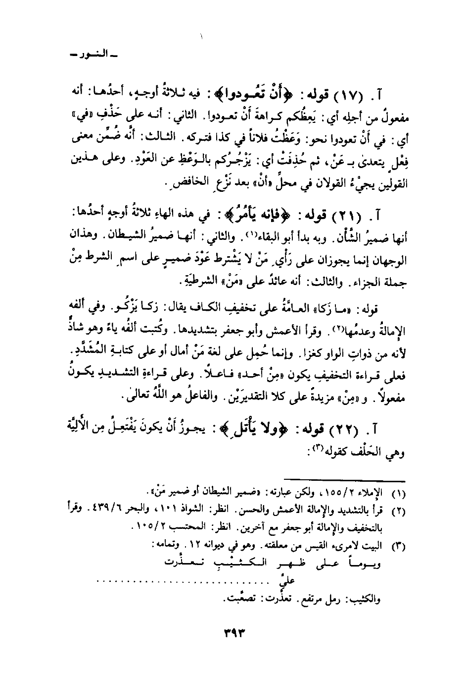 قوله: {مَا زَكَا} العامَّةُ على تخفيفِ الكاف يقال: زكا يَزْكُو. وفي ألفه الإِمالةُ وعدمُها. وقرأ الأعمش وأبو جعفر بتشديدها. وكُتبت ألفُه ياءً وهو شاذٌّ لأنه من ذواتِ الواو كغزا. وإنما حُمِل على لغةِ مَنْ أمال أو على كتابةِ المُشَدَّدِ. فعلى قراءة التخفيفِ يكون «مِنْ أحد» فاعلاً. وعلى قراءةِ التشديدِ يكونُ مفعولاً. و «مِنْ» مزيدةٌ على كلا التقديرَيْن. والفاعلُ هو اللهُ تعالى.