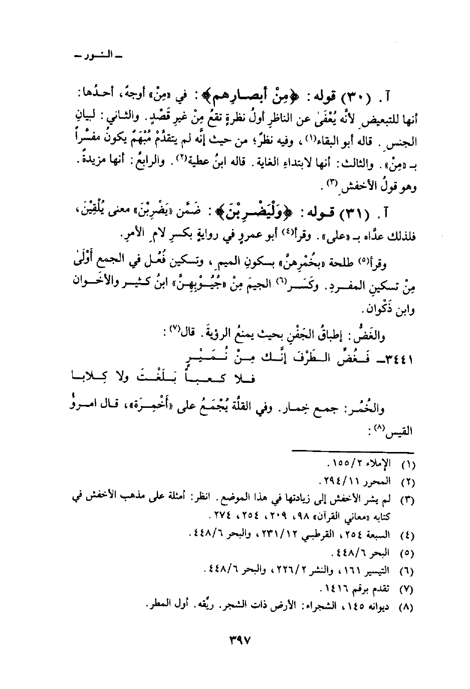 قوله: {مِنْ أَبْصَارِهِمْ} : في «مِنْ» أوجهٌ، أحدُها: أنها للتبعيضِ لأنَّه يعفى عن الناظِر أولُ نظرةٍ تقعُ مِنْ غيرِ قَصْدٍ. والثاني: لبيانٍ الجنسِ. قاله أبو البقاء، وفيه نظرٌ؛ من حيث إنَّه لم يتقدَّمْ مُبْهَمٌ يكونُ مفسَّراً ب «مِنْ» . والثالث: أنها لابتداءِ الغاية. وقاله ابنُ عطية. والرابعُ: أنها مزيدةٌ. وهو قولُ الأخفشِ.