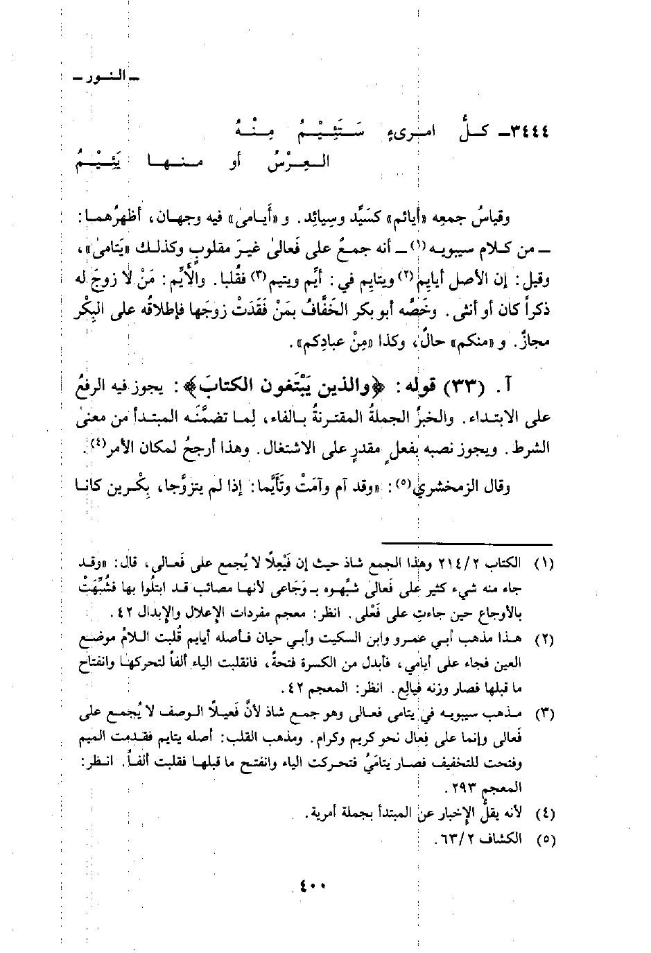 وقياسُ جمعِه «أيائم» كسَيِّد وسِيائِد. و «أيامى» فيه وجهان، أظهرُهما: من كلام سيبويه أنه جمعٌ على فعالى غيرَ مقلوبٍ وكذلك «يتامى» ، وقيل: إن الأصل أيايِم ويتايِم في: أيِّم ويتيم فقُلبا. والأَيِّم: مَنْ لا زوجَ له ذكراً كان أو أنثى. وخَصَّه أبو بكر الخَفَّافُ بمَنْ فَقَدَتْ زوجَها فإطلاقُه على البِكْر مجازٌ. و «منكم» حالٌ، وكذا «مِنْ عبادِكم» .