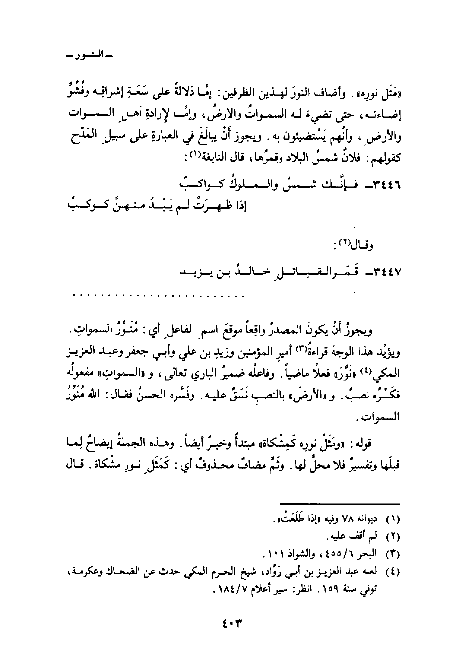 مَثَلُ نُورِهِ} . وأضاف النورَ لهذين الظرفين: إمَّا دَلالةً على سَعَةِ إشراقِه وفُشُوِّ إضاءته، حتى تضيءَ له السماواتُ والأرضُ، وإمَّا لإِرادةِ أهلِ السماوات والأرضِ، وأنَّهم يَسْتضيئون به. ويجوز أَنْ يبالَغَ في العبارةِ على سبيلِ المَدْحِ كقولهم: فلانٌ شمسُ البلاد وقمرُها، قال النابغة: