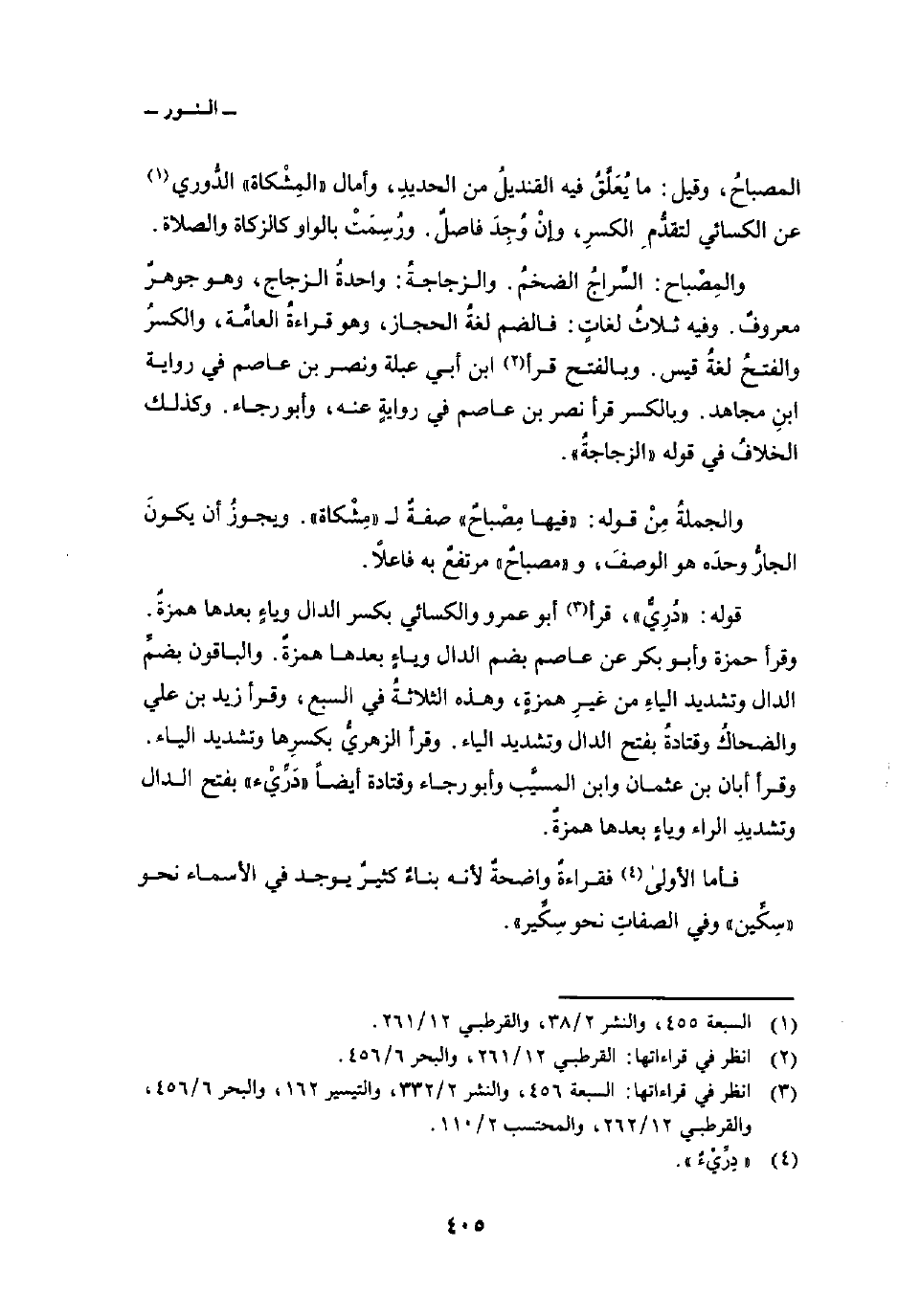 وبالفتح قرأ ابن أبي عبلة ونصر بن عاصم في رواية ابنِ مجاهد. وبالكسر قرأ نصر بن عاصم في روايةٍ عنه، وأبو رجاء. وكذلك الخلافُ في قوله «الزجاجةُ» .