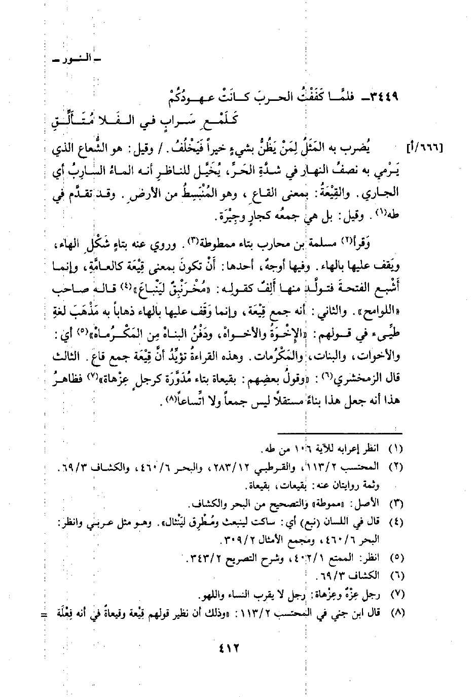 يُضرب به المَثَلُ لِمَنْ يَظُنُّ بشيءٍ خيراً فَيَخْلُفُ. / وقيل: هو الشُّعاع الذي يَرْمي به نصفُ النهار في شدَّةِ الحَرِّ، يُخَيَّل للناظرِ أنه الماءُ السارِبُ أي الجاري. والقِيْعَةُ: بمعنى القاعِ. وهو المُنبَسِطُ من الأرضِ. وقد تقدَّم في طه. وقيل: بل هي جمعُه كجارٍ وجِيْزَة.