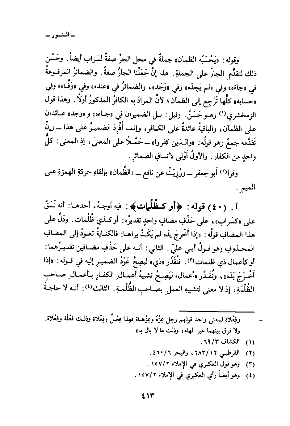 قوله: {أَوْ كَظُلُمَاتٍ} : فيه: أوجهٌ، أحدها: أنه نَسَقٌ على «كسَراب» ، على حَذْفِ مضافٍ واحدٍ تقديرُه: أو كذي ظُلُمات. ودَلَّ على هذا المضافِ قولُه: {إِذَآ أَخْرَجَ يَدَهُ لَمْ يَكَدْ يَرَاهَا} فالكنايةُ تعودُ إلى المضافِ المحذوفِ وهو قولُ أبي عليّ. الثاني: أنه على حَذْفِ مضافين تقديرُهما: أو كأعمال ذي ظلمات، فتُقَدِّر «ذي» ليصِحَّ عَوْدُ الضميرِ إليه في قوله: {إِذَآ أَخْرَجَ يَدَهُ} ، وتُقَدِّر «أعمال» ليَصِحَّ تشبيهُ أعمالِ الكفارِ بأعمالِ صاحبِ الظُلْمَةِ، إذ لا معنى لتشبيهِ العملِ بصاحبِ الظُّلْمةِ. الثالث: أنه لا حاجةَ