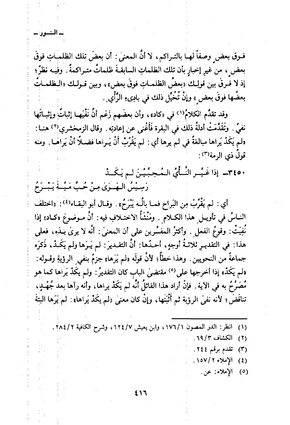 أي: لم يَقْرُبْ مِنْ البَراح فما بالُه يَبْرَحُ» . وقال أبوة البقاء: «أختلف الناسُ في تأويلِ هذا الكلامِ. ومَنْشَأُ الاختلافِ فيه: أنَّ موضوعَ» كاد «إذا نُفِيَتْ: وقوعُ الفعلِ. وأكثرُ المفسِّرين على أن المعنى: أنَّه لا يرى يدَه، فعلى هذا: في التقديرِ ثلاثةُ أوجهٍ، أحدُها: أنَّ التقديرَ: لم يَرَها ولم يَكَدْ، ذَكرَه جماعةٌ من النحويين. وهذا خطأٌ؛ لأنَّ قولَه» لم يَرَها «جزمٌ بنفيِ الرؤيةِ وقوله:» لم يَكَدْ «إذا أخرجها على مقتضى البابِ كان التقديرُ: ولم يكَدْ يَراها كما هو مُصَرَّحٌ به في الآية. فإنْ أراد هذا القائلُ أنَّه لم يَكَدْ يراها، وأنه رآها بعد جُهْدٍ، تناقَضَ؛ لأنه نفى الرؤية ثم أَثْبَتها، وإنْ كان معنى» لم يكَدْ يَراها «: لم يَرَها البتةَ