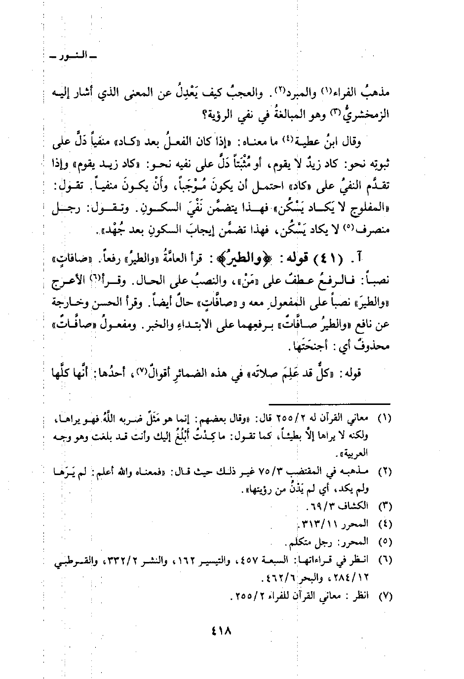 قوله: {والطير} : قرأ العامَّةُ «والطيرُ» رفعاً. «صافاتٍ» نصباً: فالرفعُ عطفٌ على «مَنْ» والنصبُ على الحال. وقرأ الأعرج «والطيرَ» نصباً على المفعولِ معه و «صافَّاتٍ» حالٌ أيضاً. وقرأ الحسن وخارجة عن نافع «والطيرُ صافَّاتٌ» برفعِهما على الابتداءِ والخبر. ومفعولُ «صافَّاتٌ» محذوفٌ أي: أجنحَتَها.