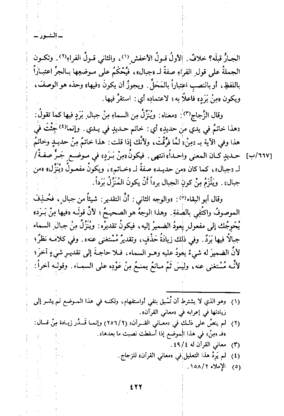 وقال أبو البقاء: «والوجه الثاني: أنَّ التقدير: شيئاً من جبالٍ، فحُذِفَ الموصوفُ واكتُفِي بالصفةِ. وهذا الوجهُ هو الصحيحُ؛ لأنَّ قولَه {فِيهَا مِن بَرَدٍ} يُحْوِجُك إلى مفعولٍ يعودُ الضميرُ إليه، فيكونُ تقديرُه: ويُنَزِّلُ مِنْ جبالِ السماء جبالاً فيها بَرَدٌ. وفي ذلك زيادَةُ حَذْفٍ، وتقديرٌ مُسْتغنى عنه» . وفي كلامه نظرٌ؛ لأنَّ الضميرَ له شيءٌ يعودُ عليه وهو السماء، فلا حاجةَ إلى تقديرِ شيءٍ آخرَ؛ لأنَّه مُسْتغنى عنه، وليسَ ثَمَّ مانعٌ يمنعُ مِنْ عَوْدِه على السماء. وقوله آخراً: «