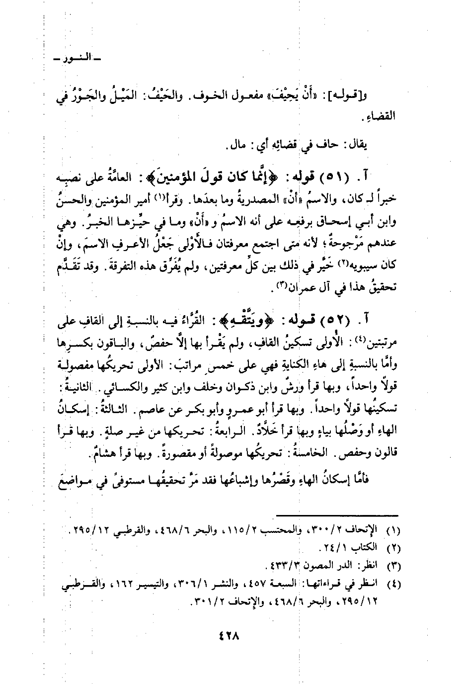 قوله: {وَيَتَّقْهِ} : القُرَّاءُ فيه بالنسبةِ إلى القافِ على مرتبتين: الأُولى تسكينُ القافِ، ولم يَقْرأ بها إلاَّ حفصٌ، والباقون بكسرِها وأمَّا بالنسبةِ إلى هاءِ الكنايةِ فهي على خمسِ مراتبَ: الأولى تحريكُها مفصولة قولاً واحداً، وبها قرأ ورشٌ وابن ذكوان وخلف وابن كثير والكسائي. الثانيةُ: تسكينُها قولاً واحداً. وبها قرأ أبو عمروٍ وأبو بكر عن عاصم. الثالثةُ: إسكانُ الهاءِ أو وَصْلُها بياءٍ وبها قرأ خَلاَّدُ. الرابعةُ: تحريكها من غير صلةٍ. وبها قرأ قالون وحفص. الخامسةُ: تحريكُها موصولةً أو مقصورةً. وبها قرأ هشامٌ.