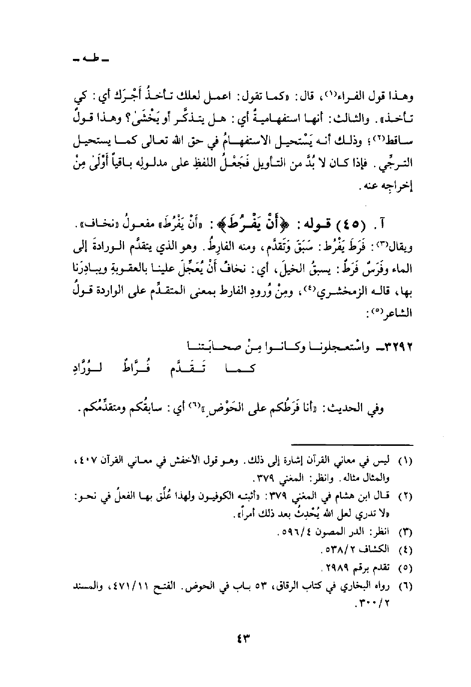قوله: {أَن يَفْرُطَ} : «أَنْ يَفْرُطَ» مفعولُ «نخاف» . ويقال: فَرَطَ يَفْرُط: سَبَقَ وَتَقَدَّم، ومنه الفارِطُ. وهو الذي يتقدَّم الورادةَ إلى الماء وفَرَسٌ فَرَطٌ: يسبقُ الخيلَ، أي: نخافُ أَنْ يُعَجِّلَ علينا بالعقوبةِ ويبادِرَنا بها، قاله الزمخشري، ومِنْ وُرودِ الفارط بمعنى المتقدِّم على الواردة قولُ الشاعر: