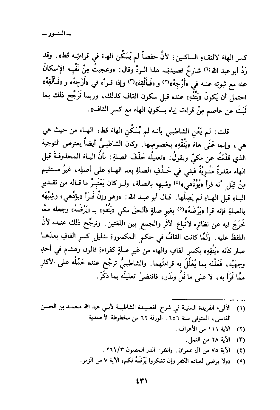 قلت: لم يَعْنِ الشاطبي بأنه لم يُسَكِّنِ الهاءَ قط، الهاء من حيث هي هي، وإنما عَنَى هاءَ «يَتَّقْهِ» بخصوصِها. وكان الشاطبيُّ أيضاً يعترض التوجيهَ الذي قدَّمْتُه عن مكيّ ويقولُ: «تعليلُه حَذْفَ الصلةِ: بأنَّ الياءَ المحذوفةَ قبل الهاء مقدرةٌ مَنْوِيَّةٌ فبقي في حَذْفِ الصلةِ بعد الهاءِ على أصلِه، غيرُ مستقيم مِنْ قِبَلِ أنه قرأ» يُؤَدِّهي «وشبهِه بالصلة، ولو كان يَعْتَبِرُ ما قاله من تقدير الياءِ قبل الهاءِ لم يَصِلْها. قال أبو عبد الله:» وهو وإنْ قَرَأ «يؤدِّهي» وشِبْهَه بالصلةِ فإنه قرأ «يَرْضَهُ» بغيرِ صلةٍ فألحقَ مكي «يَتَّقْهِ» ب «يَرْضَهُ» وجعله ممَّا خَرَجَ فيه عن نظائرِه لاتِّباع الأثَرِ والجمعِ بين اللغتين. وترجَّح ذلك عنده لأنَّ اللفظَ عليه. وَلَمَّا كانت القافُ في حكمِ المكسورةِ بدليلِ كسرِ القافِ بعدَها صار كأنه «يَتَّقِهِ» بكسرِ القافِ والهاء من غيرِ صلةٍ كقراءةِ قالون وهشام في أحدِ وجهَيْه، فَعَلَّله بما يُعَلِّلُ به قراءتَهما. والشاطبيُّ ترجَّح عنده حَمْلُه على الأكثرِ ممَّا قَرَأَ به، لا على ما قَلَّ ونَدَر، فاقتضى تعليلَه بما ذكَرَ.