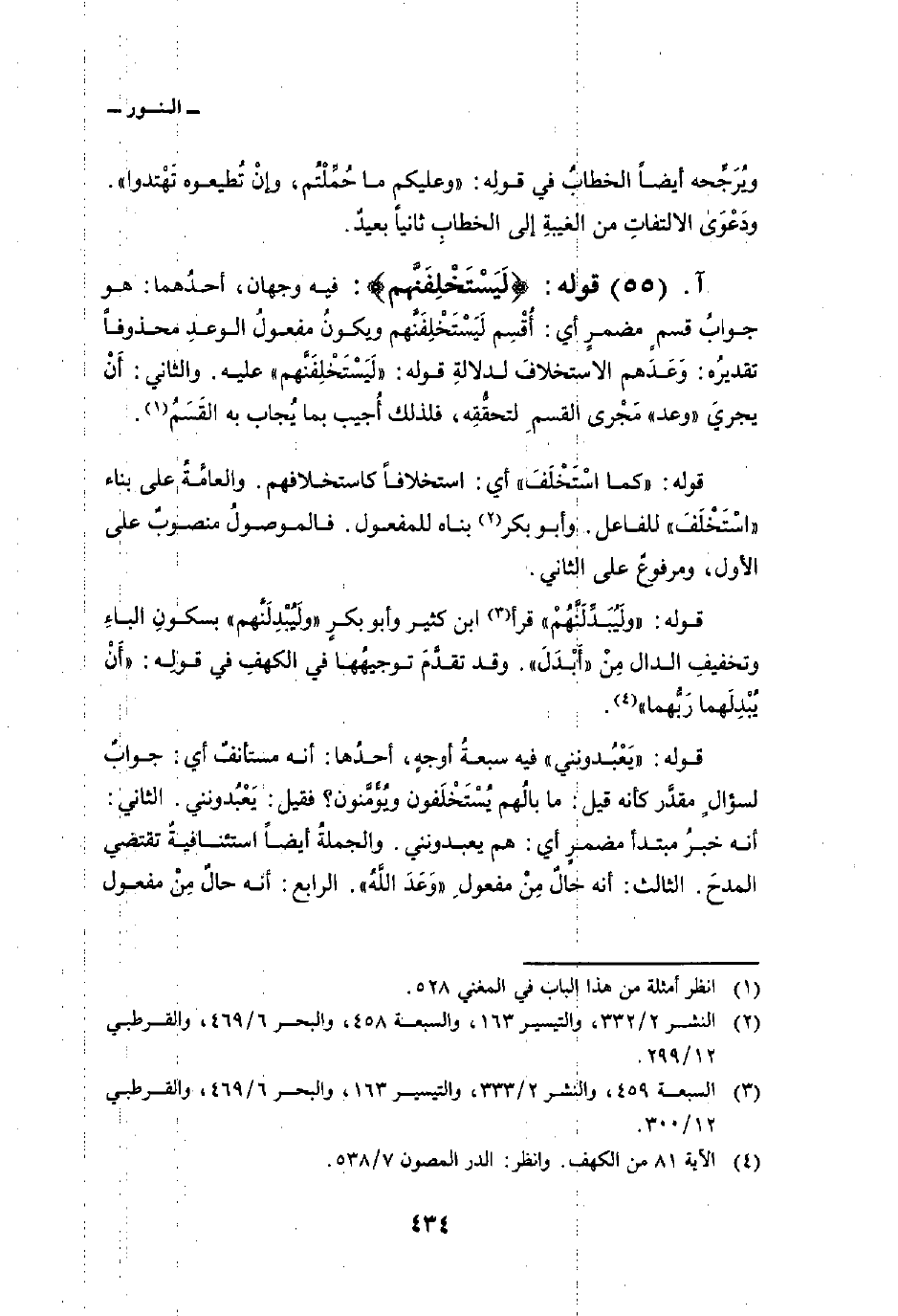 قوله: {كَمَا استخلف} أي: استخلافاً كاستخلافهم. والعامَّةُ على بناء «اسْتَخْلَفَ» للفاعل. وأبو بكر بناه للمفعول. فالموصولُ منصوبٌ على الأول، ومرفوعٌ على الثاني.