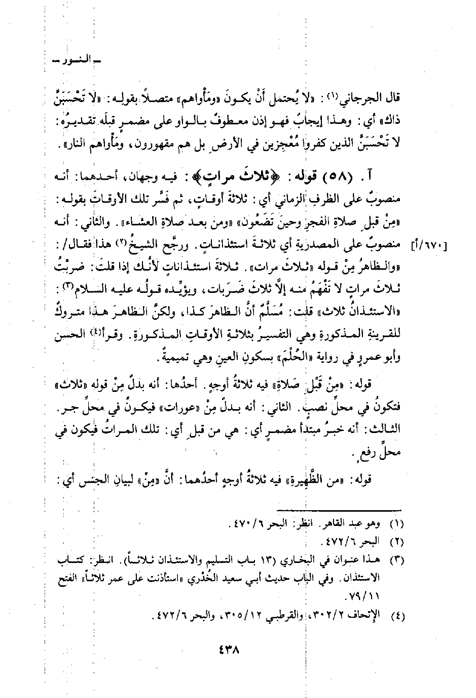 قوله: {ثَلاَثَ مَرَّاتٍ} : فيه وجهان، أحدهما: أنه منصوبٌ على الظرفِ الزماني أي: ثلاثةَ أوقاتٍ، ثم فَسَّر تلك الأوقاتَ بقوله: {مِّن قَبْلِ صلاوة الفجر وَحِينَ تَضَعُونَ} {وَمِن بَعْدِ صلاوة العشآء} . والثاني: أنه منصوبٌ على المصدريةِ أي ثلاثةَ استئذاناتٍ. ورجَّحَ الشيخُ هذا فقال/: «والظاهرُ مِنْ قوله» ثلاثَ مرات «. ثلاثةَ استئذاناتٍ لأنَّك إذا قلتَ: ضربْتُ ثلاثَ مراتٍ لا تفْهَمُ منه إلاَّ ثلاثَ ضَرَبات. ويؤيِّده قولُه عليه السلام:» الاستئذانُ ثلاث «قلت: مُسَلَّمٌ أنَّ الظاهرَ كذا، ولكنَّ الظاهرَ هذا متروكٌ للقرينةِ المذكورةِ وهي التفسيرُ بثلاثةِ الأوقاتِ المذكورةِ. وقرأ الحسن وأبو عمرٍو في رواية» الحُلْمَ «بسكونِ العينِ وهي تميميةٌ.
