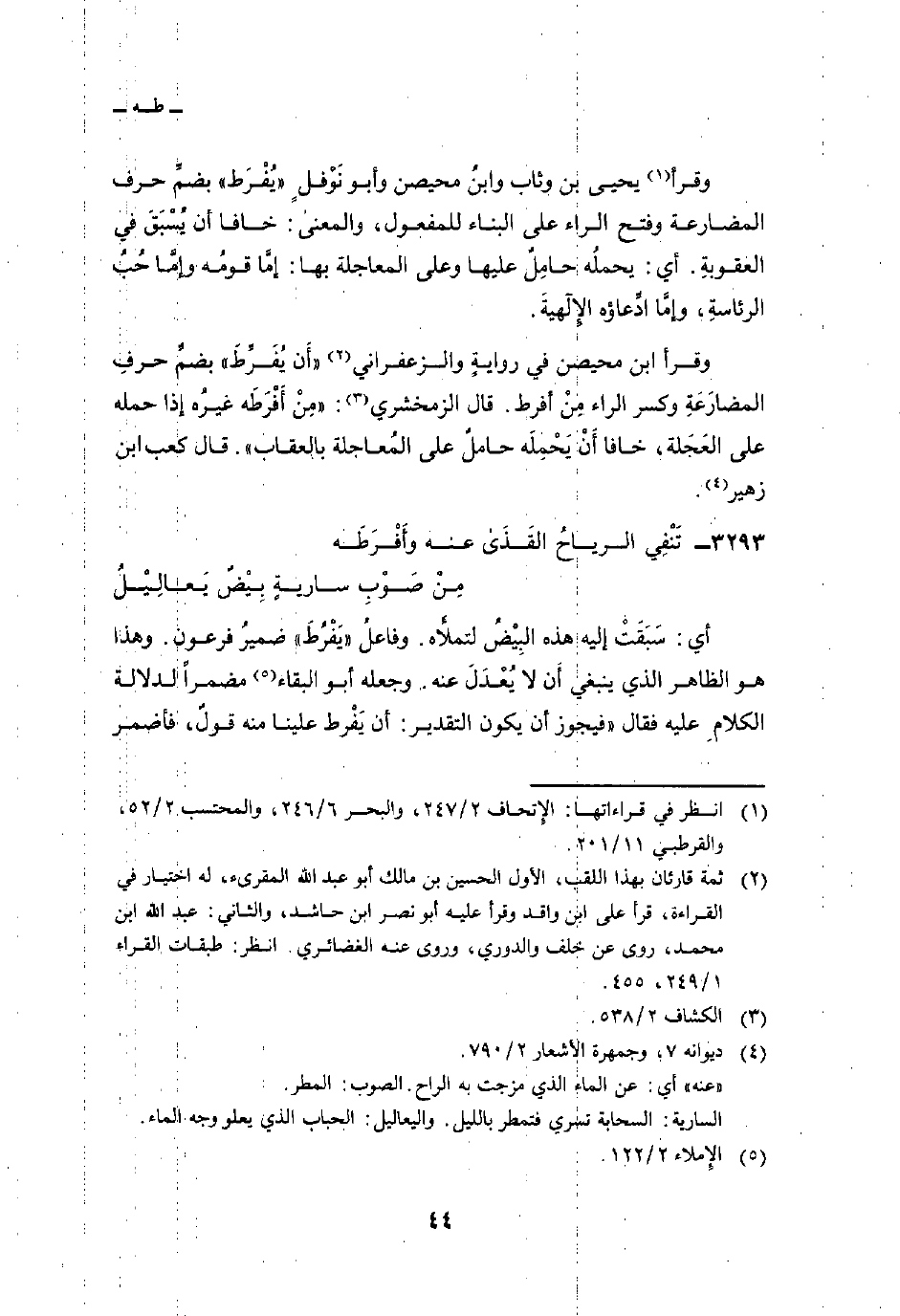 وقرأ ابن محيصن في روايةٍ والزعفراني «أَن يُفَرِّطَ» بضمِّ حرفِ المضارَعَةِ وكسر الراء مِنْ أفرط. قال الزمخشري: «مِنْ أَفْرَطَه غيرُه إذا حمله على العَجَلة، خافا أَنْ يَحْمِلَه حاملٌ على المُعاجلة بالعقاب» . قال كعب ابن زهير.