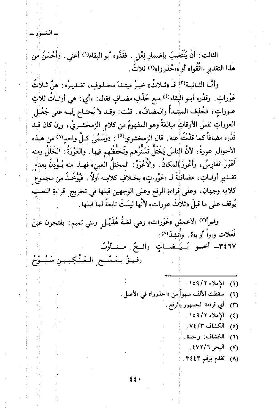 قال الزمخشري: «وسمى كلَّ واحدٍ من هذه الأحوالِ عورةً؛ لأنَّ الناسَ يَخْتَلُّ تَسَتُّرُهم وتَحَفُّظُهم فيها. والعَوْرَةُ: الخَلَلُ ومنه أَعْوَرَ الفارِسُ، وأَعْوَرَ المكانُ. والأَعْوَرُ: المختلُّ العينِ» فهذا منه يُؤْذِنُ بعدمِ تقديرِ أوقاتِ، مضافةً ل «عَوْراتٍ» بخلافِ كلامِه أولاً. فيُؤْخَذُ من مجموعِ كلامِه وجهان، وعلى قراءةِ الرفع وعلى الوجهين قبلها في تخريجِ قراءةِ النصبِ يُوقف على ما قبلَ {ثَلاَثَ عَوْرَاتٍ} لأنَّها ليسَتْ تابعةً لما قبلها.