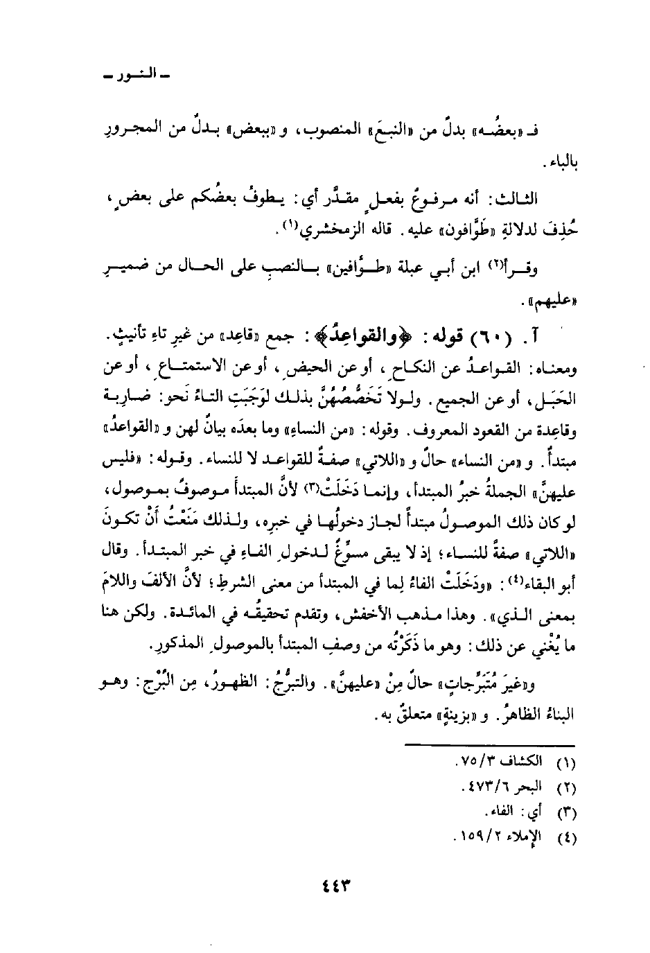 قوله: {والقواعد} : جمع «قاعِد» من غيرِ تاءِ تأنيثٍ. ومعناه: القواعدُ عن النكاحِ، أو عن الحيضِ، أو عن الاستمتاعِ، أو عن الحَبَل، أو عن الجميع. ولولا تَخَصُّصُهُنَّ بذلك لوَجَبَتِ التاءُ نَحو: ضارِبة وقاعِدة من القعود المعروف. وقوله: {مِنَ النسآء} وما بعدَه بيانٌ لهن و «القواعدُ» مبتدأٌ. و «من النساء» حالٌ و «اللاتي» صفةٌ للقواعد لا للنساء. وقوله: {فَلَيْسَ عَلَيْهِنَّ} الجملةُ خبرُ المبتدأ، وإنما دَخَلَتْ لأَنْ المبتدأَ موصوفٌ بموصول، لو كان ذلك الموصولُ مبتدأً لجاز دخولُها في خبرِه، ولذلك مَنَعْتُ أَنْ تكونَ «اللاتي» صفةً للنساء؛ إذ لا يبقى مسوِّغٌ لدخولِ الفاءِ في خبر المبتدأ. وقال أبو البقاء: «ودَخَلَتْ الفاءُ لِما في المبتدأ من معنى الشرطِ؛ لأنَّ الألفَ واللامَ بمعنى الذي» . وهذا مذهب الأخفش، وتقدم تحقيقُه في المائدة. ولكن هنا ما يُغْني عن ذلك: وهو ما ذَكَرْتُه من وصفِ المبتدأ بالموصولِ المذكورِ.