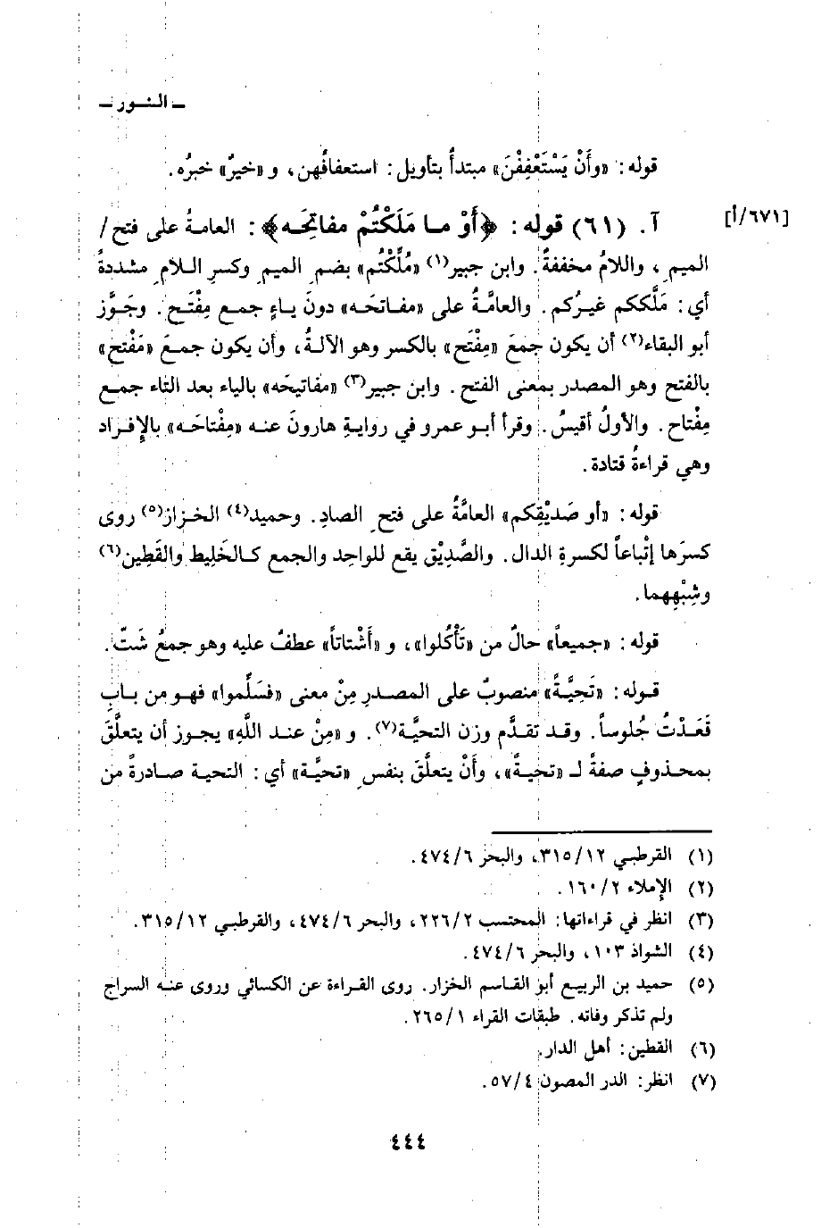 قوله: {أَوْ مَا مَلَكْتُمْ مَّفَاتِحهُ} : العامةُ على فتح/ الميمِ، واللامُ مخففةٌ. وابن جبير «مُلِّكْتُم» بضمِ الميمِ وكسرِ اللامِ مشددةً أي: مَلَّككم غيرُكم. والعامَّةُ علكى «مفاتحَه» دونَ ياءٍ جمع مِفْتَح. وجَوَّز أبو البقاء أن يكون جمع «مِفْتَح» بالكسرِ وهو الآلةُ، وأن يكون جمعَ «مَفْتح» بالفتح وهو المصدر. بمعنى الفتح. وابن جبير «مفاتيحَه» بالياء بعد التاء جمع مِفْتاح. والأولُ أقيسُ. وقرأ أبو عمرو في روايةِ هارونَ عنه «مِفتْاحَه» بالإِفراد وهي قراءةُ قتادة.