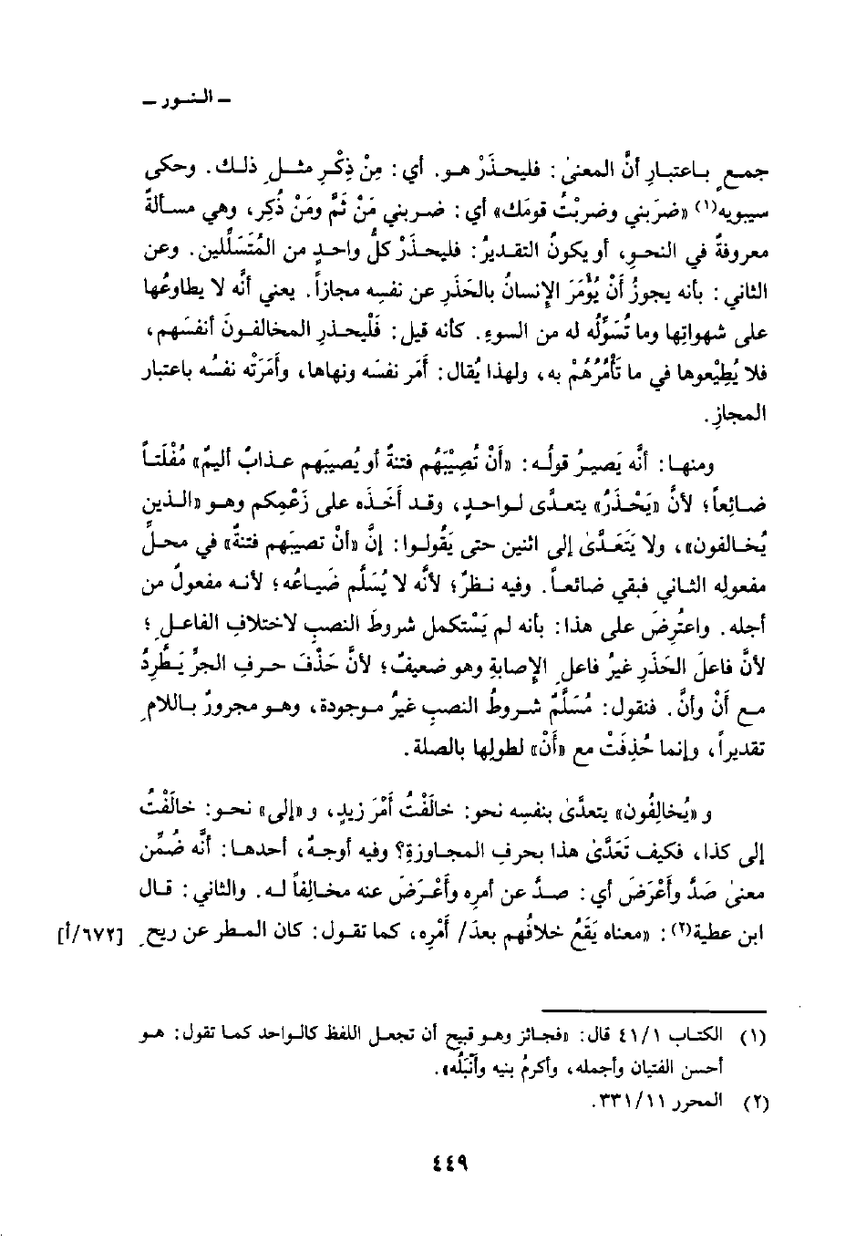 ومنها: أنَّه يَصيرُ قولُه: {أَن تُصِيبَهُمْ فِتْنَةٌ أَوْ يُصِيبَهُمْ عَذَابٌ أَلِيمٌ} مُفْلَتاً ضائِعاً؛ لأنَّ «يَحْذَرُ» يتعدَّى لواحدٍ، قد أَخَذَه على زَعْمِكم وهو «الذين يُخالفون» ، ولا يتعدى إلى اثنين حتى يَقُولوا: إنَّ «أنْ تصيبَهم فتنةٌ» في محلِّ مفعولِه الثاني فبقي ضائعاً. وفيه نظرٌ؛ لأنَّه لا يُسَلَّم ضَياعُه؛ لأنه مفعولٌ من أجله. واعتُرِضَ على هذا: بأنه لم يَسْتكمل شروطَ النصبِ لاختلافِ الفاعلِ؛ لأنَّ فاعلَ الحَذَرِ غيرُ فاعلِ الإِصابةِ وهو ضعيفٌ؛ لأنَّ حَذْفَ حرفِ الجرِّ يَطَّرِدُ مع أَنْ وأنَّ. فنقول: مُسَلَّمٌ شروطُ النصبِ غيرُ موجودة، وهو مجرورٌ باللامِ تقديراً، وإنما حُذِفَتْ مع «أَنْ» لطولِها بالصلة.