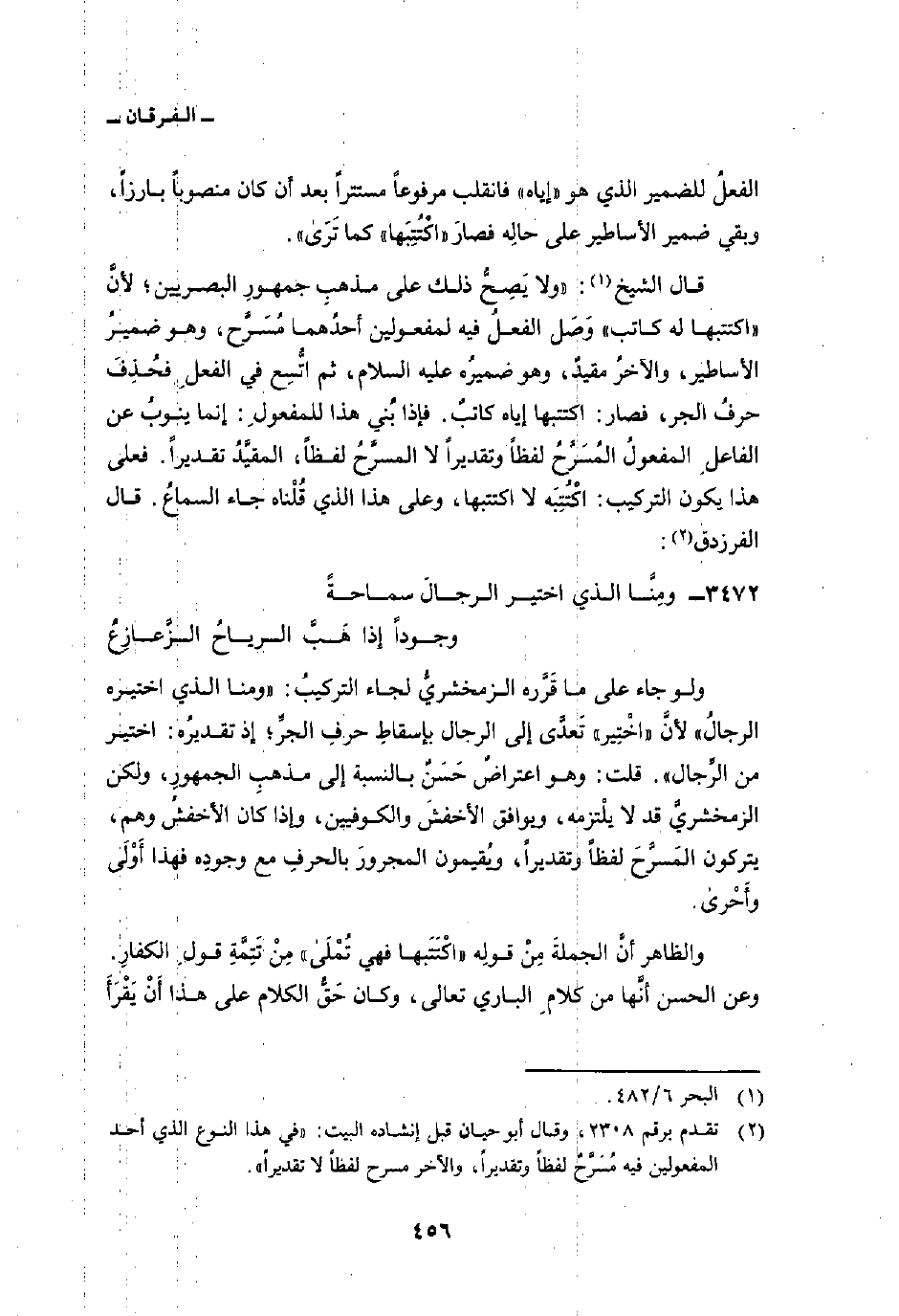 قال الشيخ: «ولا يَصِحُّ ذلك على مذهبِ جمهورِ البصريين؛ لأنَّ» اكتتبها له كاتب «وَصَل الفعلُ فيه لمفعولين أحدُهما مُسَرَّح، وهو ضميرُ الأساطير، والآخرُ مقيدٌ، وهو ضميرُه عليه السلام، ثم اتُّسِع في الفعلِ فحُذِفَ حرفُ الجر، فصار: اكتتبها إياه كاتبٌ. فإذا بُني هذا للمفعولِ: إنما ينوبُ عن الفاعلِ المفعولُ المُسَرَّحُ لفظاً وتقديراً لا المسرَّحُ لفظاً، المقيَّدُ تقديراً. فعلى هذا يكون التركيب اكْتُتِبَه لا اكتتبها، وعلى هذا الذي قُلْناه جاء السماعُ. قال: الفرزدق: