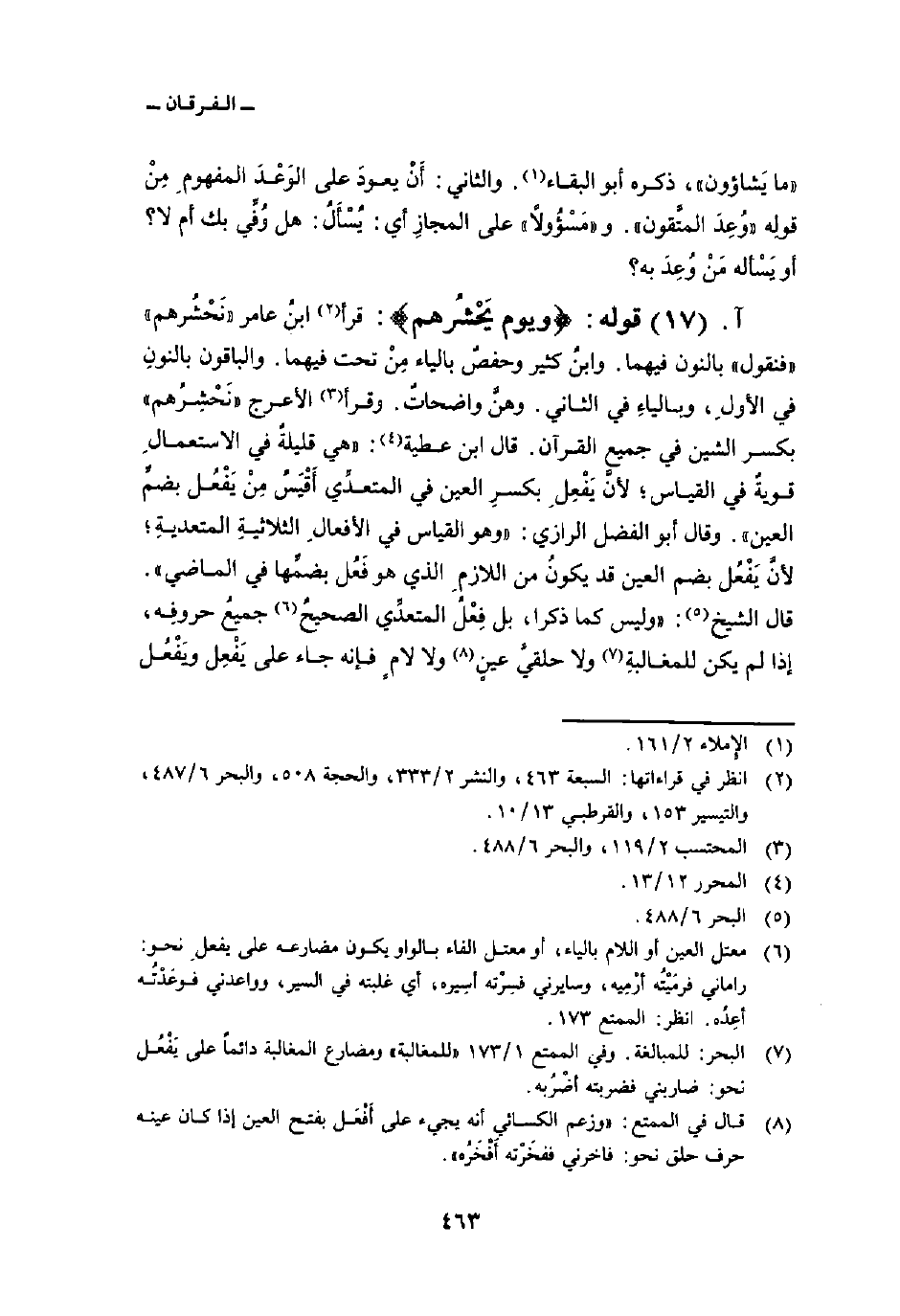 قوله: {وَيَوْمَ يَحْشُرُهُمْ} : قرأ ابنُ عامر «نَحْشُرهم» ِ «فنقول» بالنون فيهما. وابنُ كثير وحفصٌ بالياء مِنْ تحت فيهما. والباقون بالنونِ في الأولِ، وبالياءِ في الثاني. وهنَّ واضحاتٌ. وقرأ الأعرج «نَحْشِرُهم» بكسر الشين في جميع القرآن. قال ابن عطية: «هي قليلةٌ في الاستعمالِ قويةٌ في القياس؛ لأنَّ يَفْعِلِ بكسرِ العين في المتعدِّي أَقْيَسُ مِنْ يَفْعُل بضمِّ العين» . وقال أبو الفضل الرازي: «وهو القياس في الأفعالِ الثلاثيةِ المتعديةِ؛ لأنَّ يَفْعُل بضهم العين قد يكونُ من اللازمِ الذي هو فَعُل بضمِّها في الماضي» . قال الشيخ: «وليس كما ذكرا، بل فِعْلُ المتعدِّي الصحيحُ جميعُ حروفِه، إذا لم يكن للمغالبةِ ولا حلقيَّ عينٍ ولا لامٍ فإنه جاء على يَفْعِل ويَفْعُل
