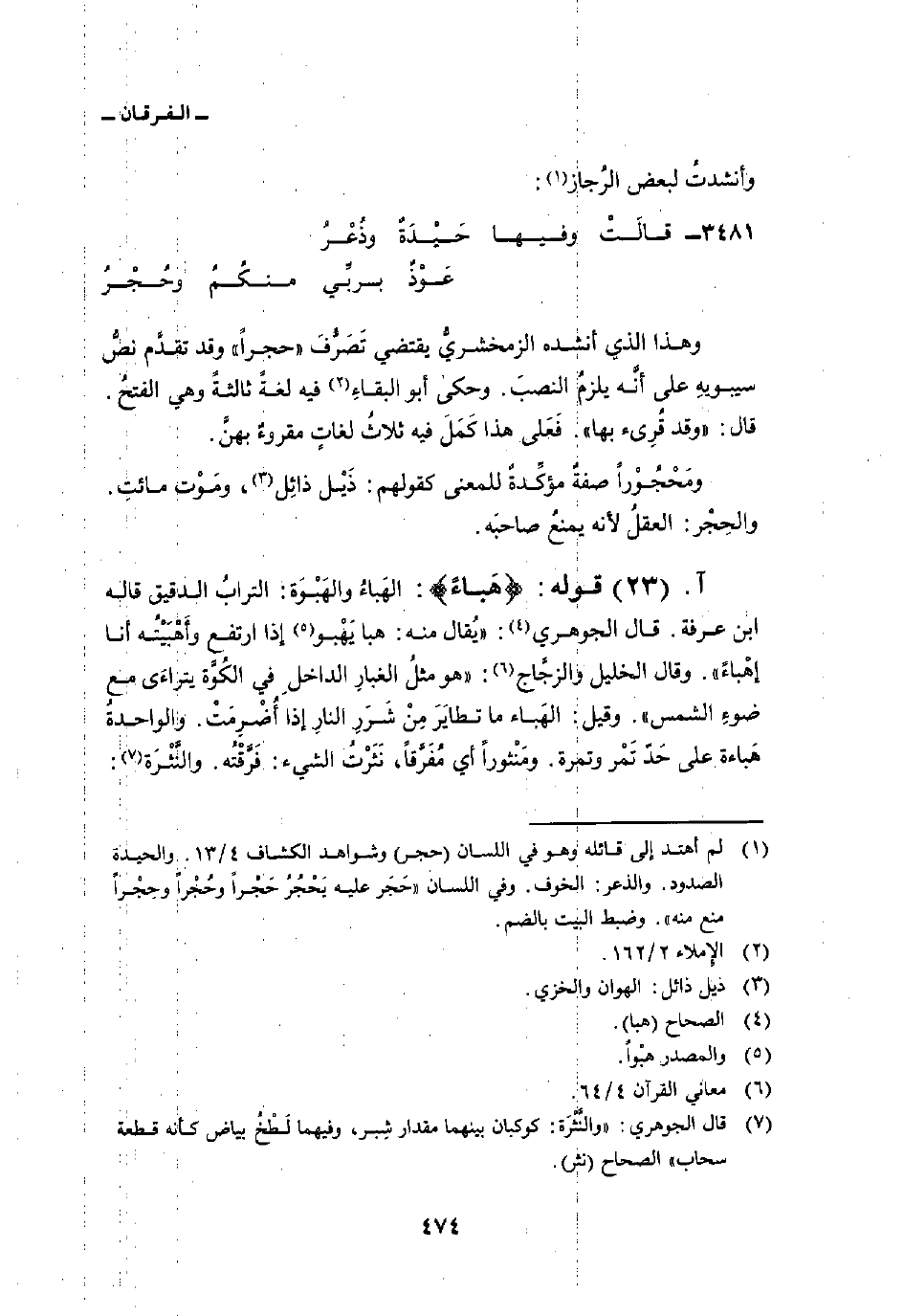 وهذا الذي أنشده الزمخشريُّ يقتضي تَصَرُّفَ «حجراً» وقد تقدَّم نصُّ سيبويهِ على أنَّه يلزمُ النصبَ. وحكى أبو البقاءِ فيه لغةً ثالثةً وهي الفتحُ. قال: «وقد قُرِىء بها» . فَعَلى هذا كَمَلَ فيه ثلاثُ لغاتٍ مقروءٌ بهنَّ.