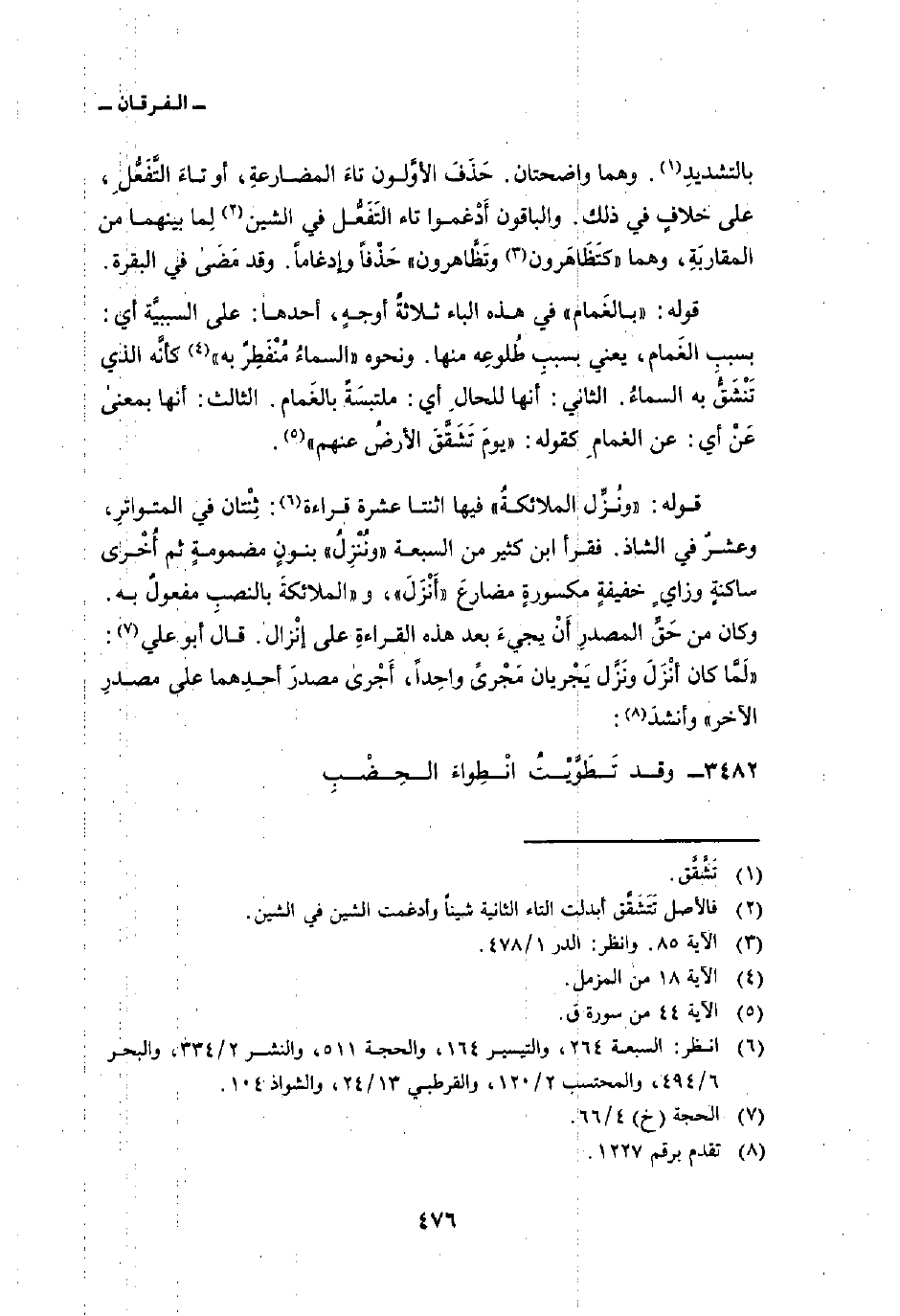 بالتشديدِ. وهما واضحتان. حَذَفَ الأَوَّلون تاءَ المضارعةِ، أو تاءَ التَّفَعُّلِ، على خلافٍ في ذلك. والباقون أَدْغموا تاء التَفَعُّل في الشين لِما بينهما من المقاربَةِ، وهما «كَتَظَاهَرون وتَظَّاهرون» حَذْفاً وإدغاماً. وقد مضى في البقرة.