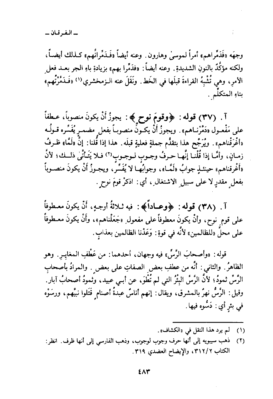 قوله: {وَأَصْحَابَ الرس} فيه وجهان، أحدهما: من عَطْفِ المغايِرِ. وهو الظاهرُ. والثاني: أنَّه من عطفِ بعضِ الصفاتِ على بعضٍ. والمرادُ بأصحابِ الرِّسِّ ثمودُ؛ لأنَّ الرَّسَّ البِئْرُ التي لم تُطْوَ، عن أبي عبيد، وثمودُ أصحابُ آبار. وقيل: الرَّسُ نهرٌ بالمشرق، ويقال: إنهم أناسٌ عبدةُ أصنامٍ قَتَلوا نبيَّهم، ورسَوْه في بئرٍ أي: دَسُّوه فيها.